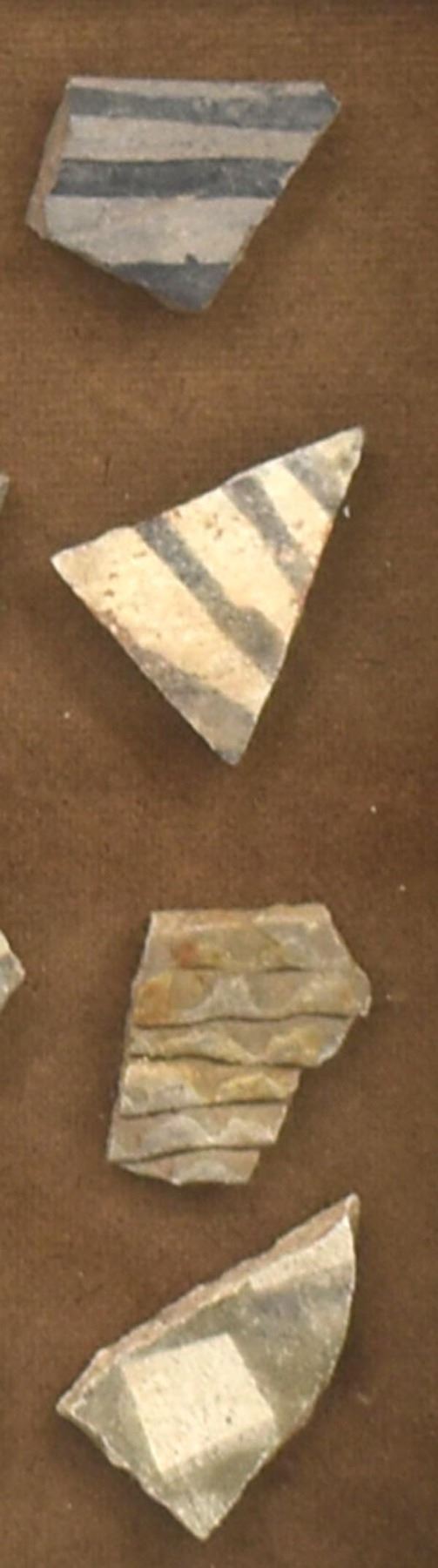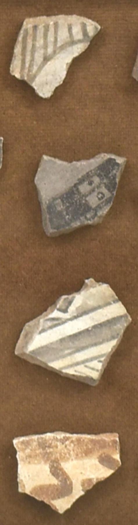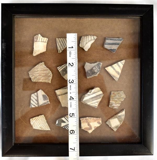 Framed Shadowbox of Prehistoric Native American Pottery Sherds, includes both black on white and corrugated utilitarian, frame measures 9'' x 9'' and largest sherd measures 1.25'' x 1''