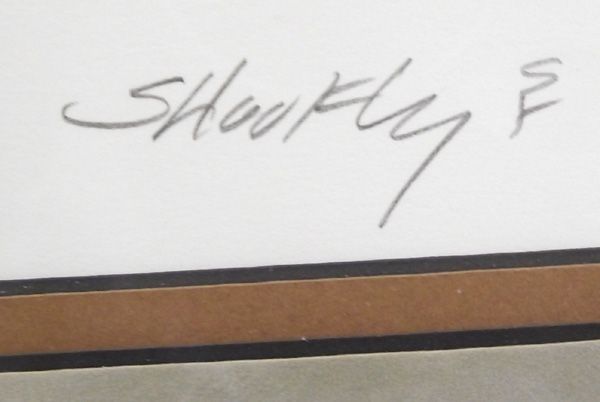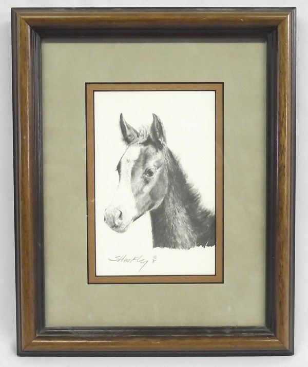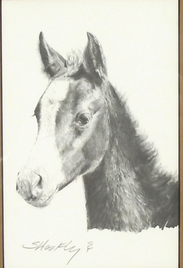Framed Signed Print Foal - Robert ''Shoofly'' Shufelt. Extraordinary lifelike pencil drawing by famous artist best known ''Shoofly''. This one has a visual measurement of 6.25''H x 4''W and is under a double mat, glass and in wood frame that measures 9.75''W x 12''H. Known for pencil drawings of western scenes, Robert ''Shoofly'' Shufelt was born in Illinois in 1935, and has called Arizona home since 1976. Shufelt was early on inspired by his high school teacher De Witt Whistler. He earned a degree from the University of Illinois and worked for twenty years as an illustrator in Chicago, doing advertising and television story boards. In 1976, Shufelt moved to Arizona with his wife Julie to live on her family ranch in Wickenburg. He took up cowboy activities and decided that was the subject matter for his fine art. Though he was urged by galleries and teachers to paint, Shufelt never gave up drawing as his medium of choice.