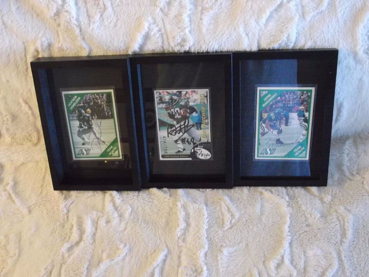 Framed Signed Sask Roughrider Cards (3 Cards, Don Narcisse Ltd. ED. Gene Makowsky, Ventson Donelson)