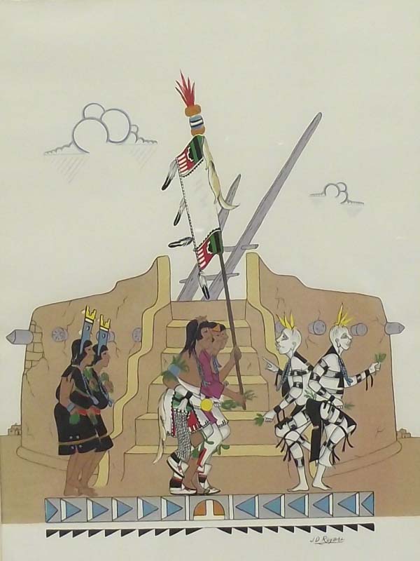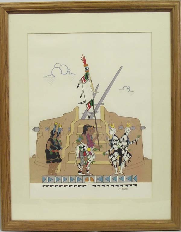 Framed Silk Screen Print by J. D. Roybal Native American from San Ildefanso Pueblo. Framed in a wood frame, matted, under glass. Visual measures approx. 19''H x 15''W. Artist information on the back of the artwork. Buyers Pay Actual Shipping and Handling Charges(see terms and conditions for more information).