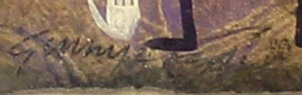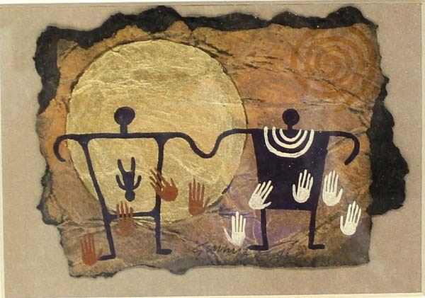 Framed Southwest Petroglyph Print ''Eagle Clan; Expecting Couple'' by Ginny Hogan, matted and under glass, visual measures 5'' x 6.5'', FYI: Ginny's home and studio are located in Santa Fe, NM. ''As a self-taught artist my initial images were inspired by cave and rock art, paintings and pecking called pictographs and petroglyphs made by native peoples all over the world. It is commonly believed these were used for shamanic rituals involving healing, hunting, fertility and protection.
