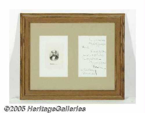 <B>Framed Spinner Vignette and Letter.</B></I> A beautifully framed Spinner presentation with a high quality Bureau vignette on the left and a July 21, 1874 handwritten letter on the right. The letter was written as Treasurer. It's a simple note to a Mr. Justin Ethridge of Coldwater, MI. A very attractive item ready for hanging.
