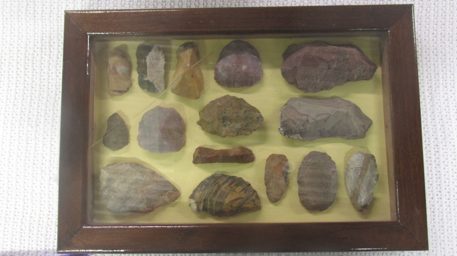Framed Stone Artifacts. 15 total. Knives and scrapers. Comes in glass front frame. Glass is cracked.