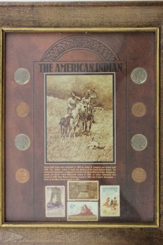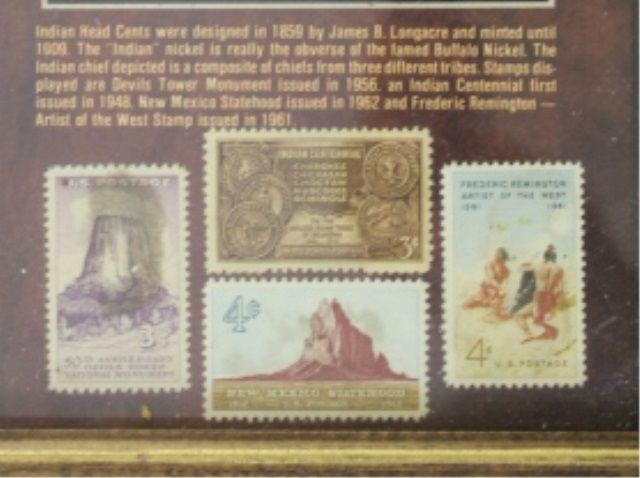 Framed the American Indian Coin and Stamp Set includes Buffalo Nickels and Indian Head Pennies and United States Uncancelled postage Stamps depicting western Scenes