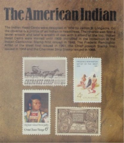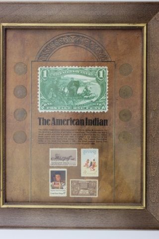 Framed The American Indian Coin and Stamp set includes eight Indian Head Pennies and 4 Native American Themed uncancelled United States Postage Stamps