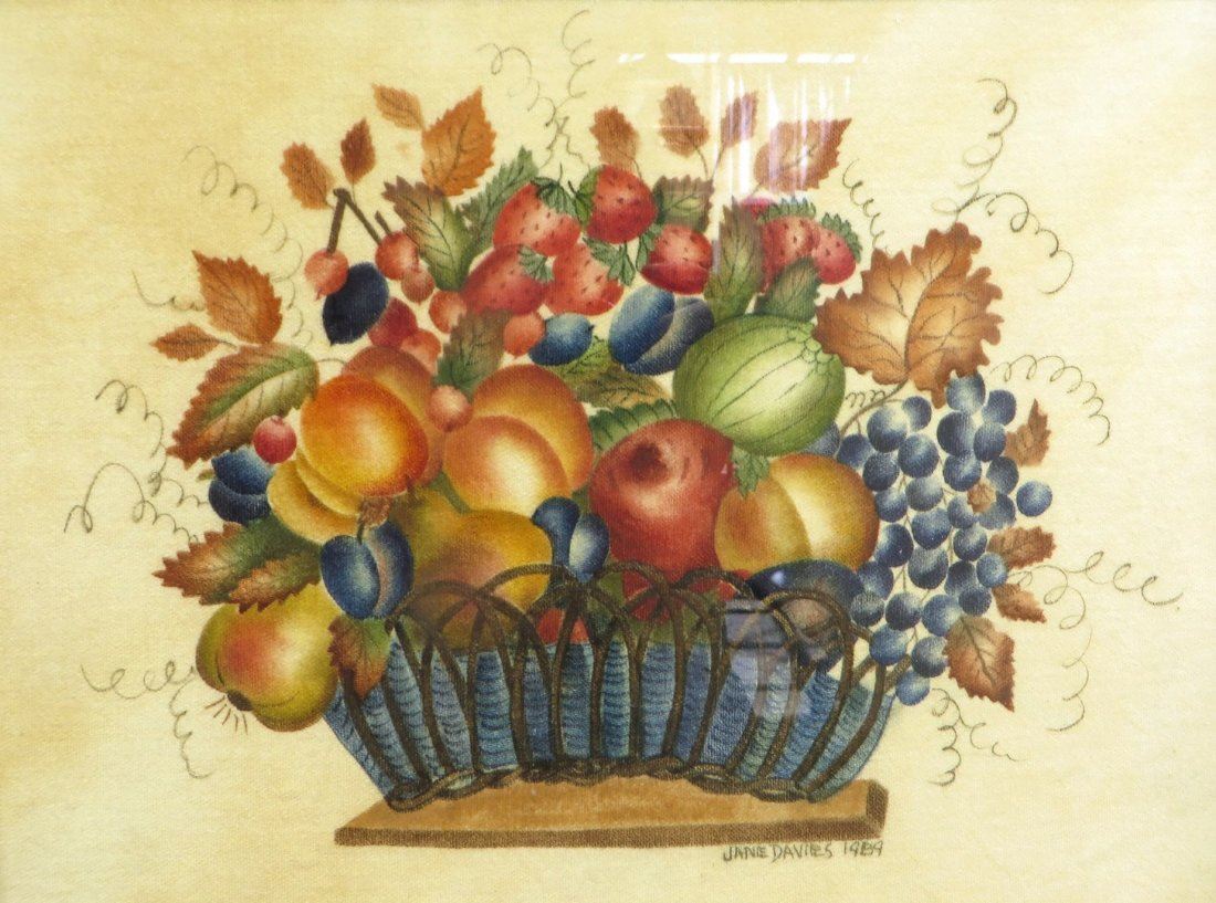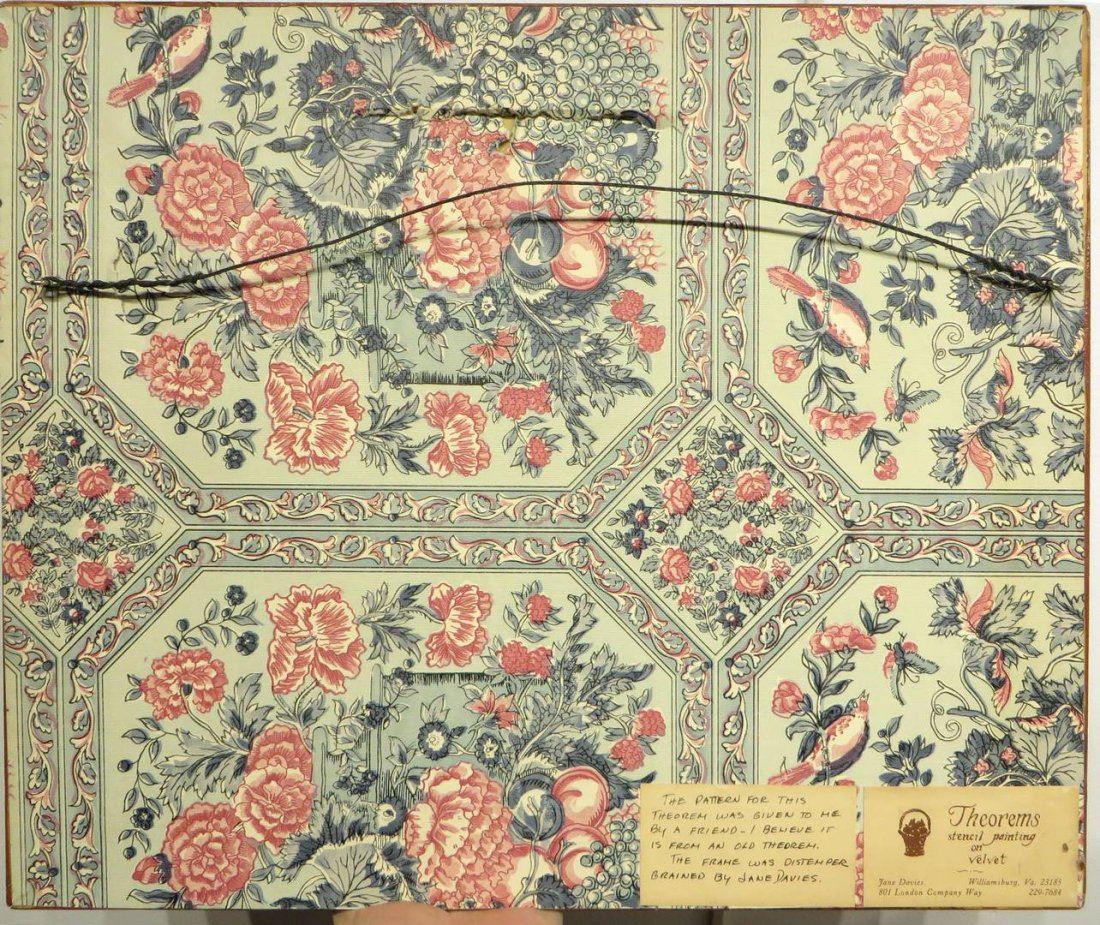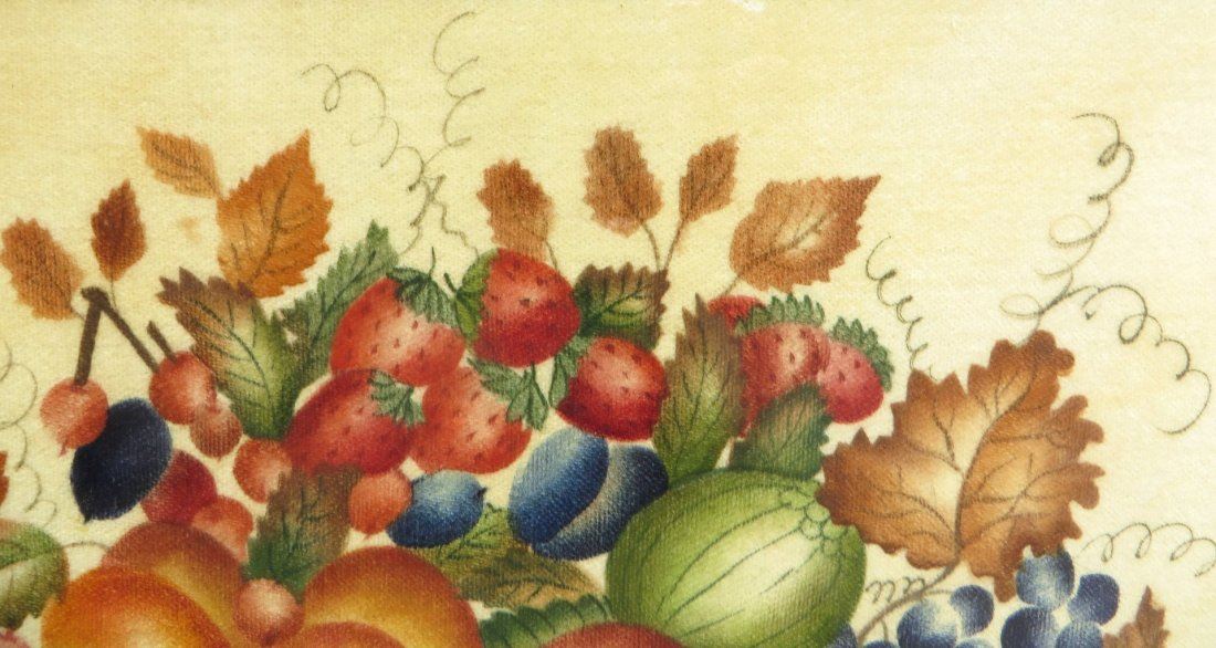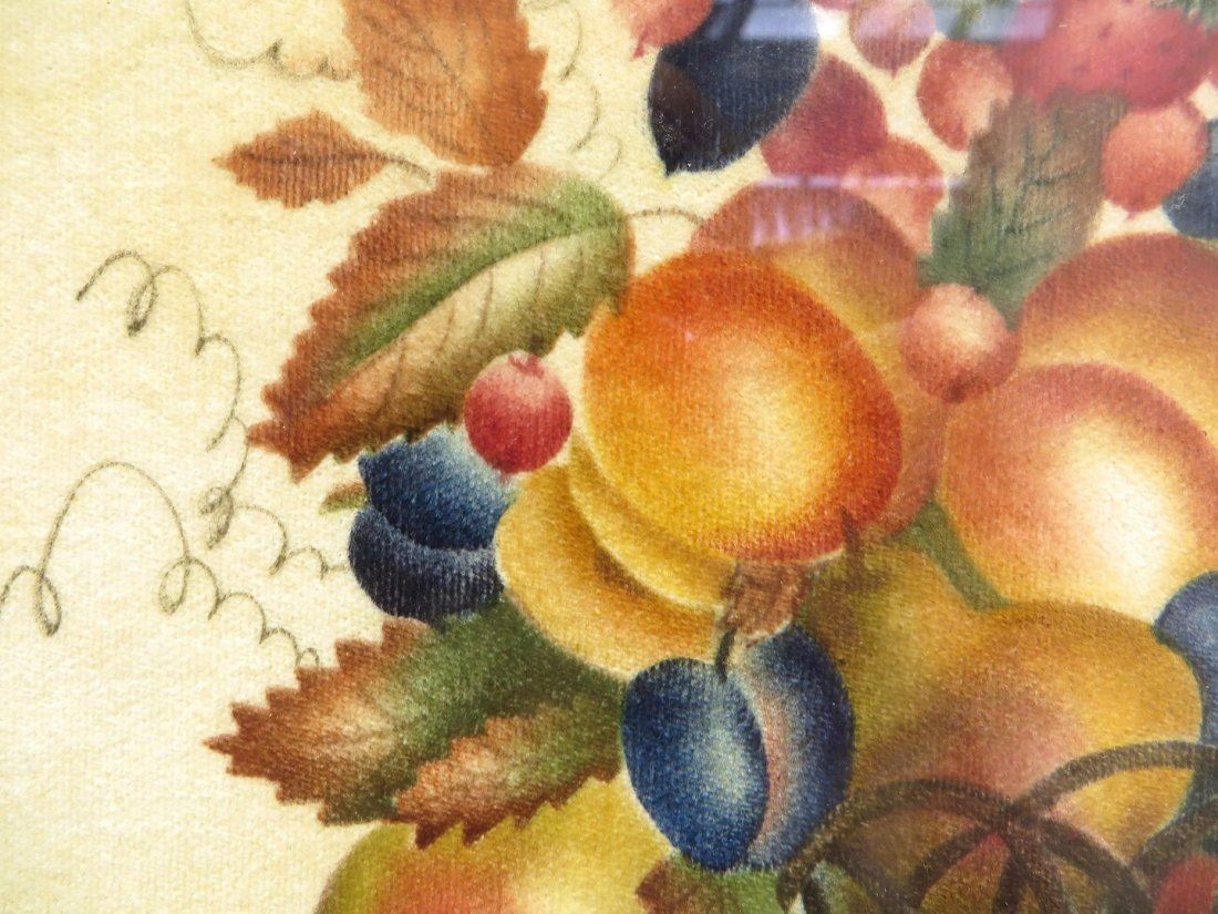 Traditionally painted still life of basket with fruit and leaves. In a distempered hand painted faux grain frame. Stencil painted on velvet. Circa 1989. NO RESERVE! ! Most items in this sale have no reserve