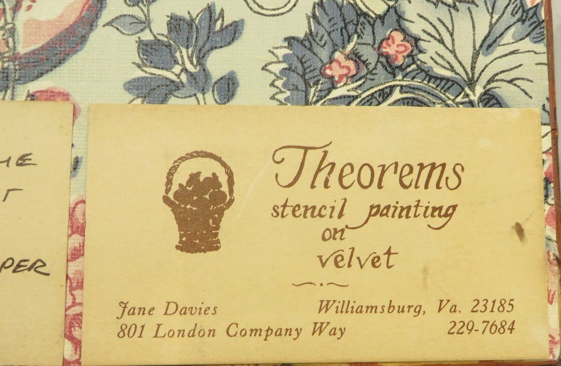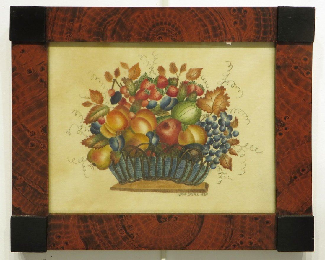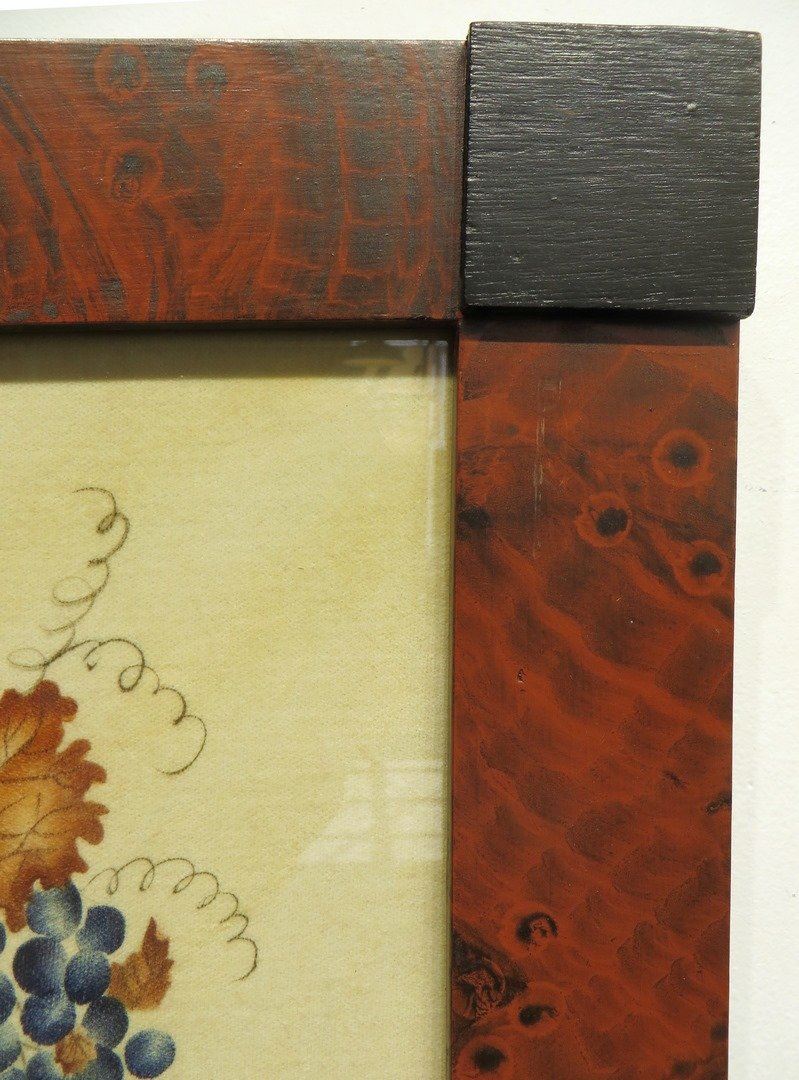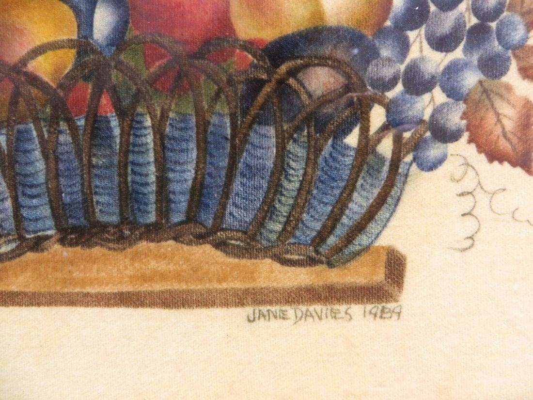 Traditionally painted still life of basket with fruit and leaves. In a distempered hand painted faux grain frame. Stencil painted on velvet. Circa 1989. NO RESERVE! ! Most items in this sale have no reserve