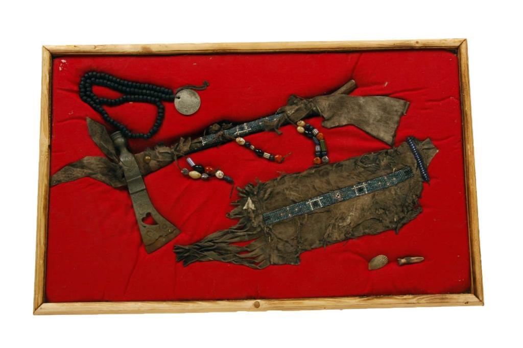 Framed Tomahawk and Pipe Bag with Osage Nation Necklace.