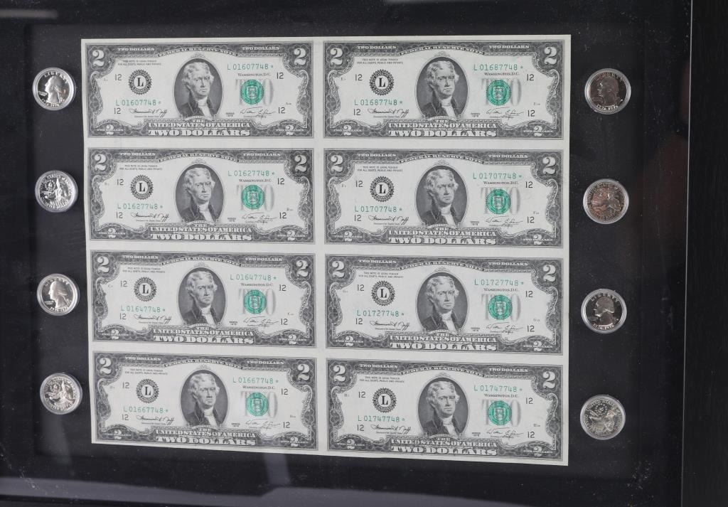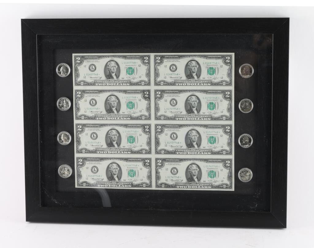 All coins in mint condition, with 20$ uncut sheet. Bills and coins are dated 1976.Framed and matted ihn wood frame.