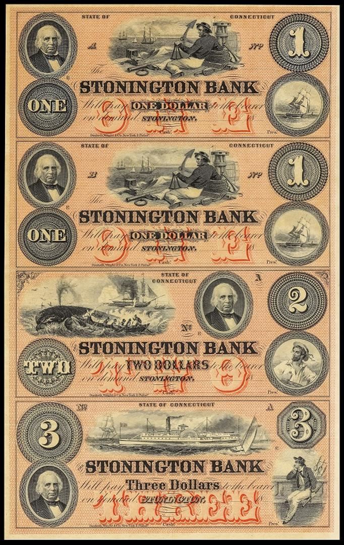 One Framed Uncut Sheet of 1800's $1/1/2/3 Stonington Bank CT Obsolete Notes.