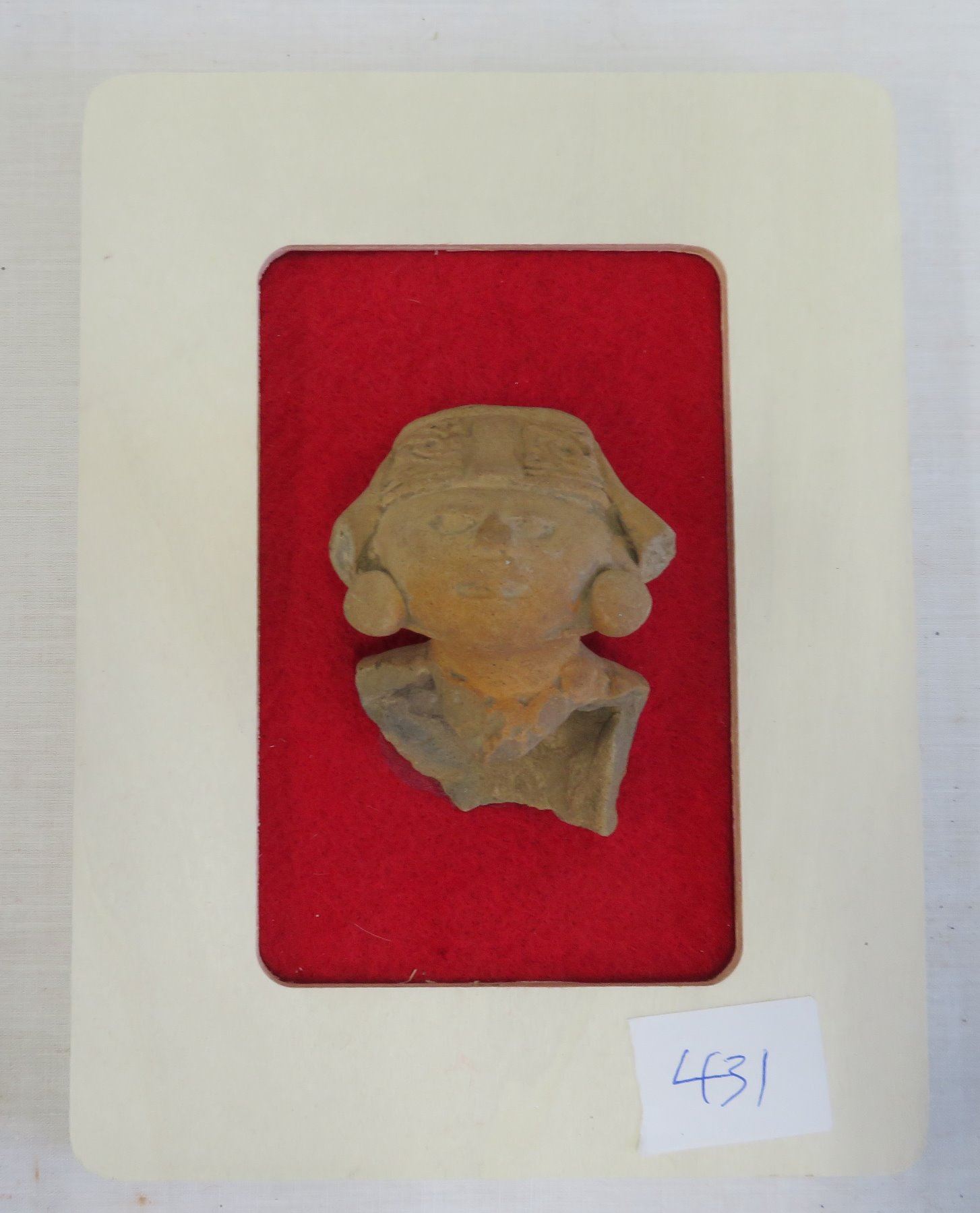 Framed Veracruz Bust, pre-Columbian item. Made of clay and wood frame, the item measures 3" x 2" x 2". Veracruz, Mexico. Smiling boy face, frame included. Condition: As found, see images. Shipping: $20.00 w/insurance and signature.