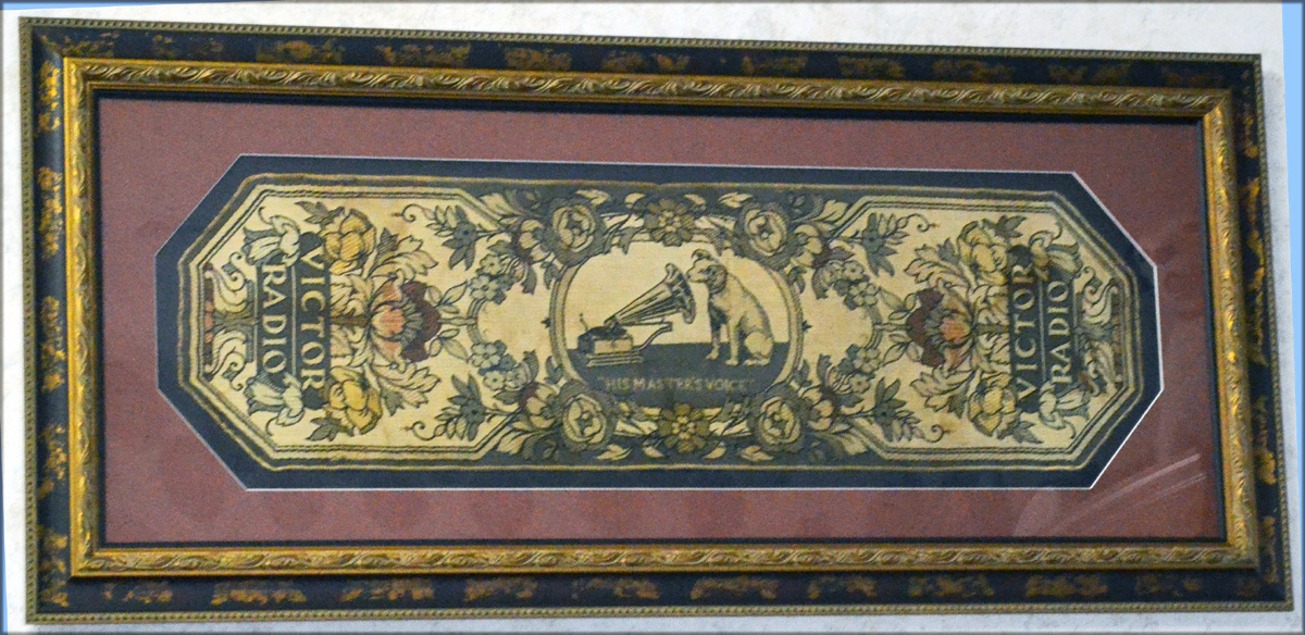 Professionally, framed and matted tapestry or dresser scarf advertising Victor Radio depicting the RCA Trademark Nipper listening to “His Master’s Voice.” Overall framed sized approx. 25” x 56” W. Tapestry measures approx. 44” x 14.”