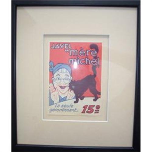 Wonderful, original, vintage (probably early 1930s) product label for Javel (a product name for bleach) Mere Michel - the label says it is the 'only one guaranteed' (la seule garantissant). We love the black cat and the details of the housewife. This vintage label is in excellent condition and beautifully framed. Purchased in Europe from a dealer who specializes in old paper and specifically old labels. In pristine condition. Measures 3 x 4 unframed and 9 x 10.5 framed. Please check out our other items for sale and contact us with any questions, or requests for additional photos. Thank You!