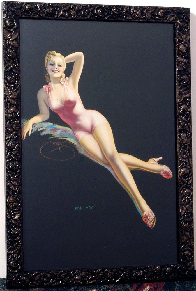 This is a framed vintage 1940s pin-up print by Billy DeVorss titled Pink Lady. Framed behind glass in a really unique vintage wood frame with sculpted roses around the entirety of its face, this is from the estate of a big pin-up collector. SIZE: Approx. 12" x 17 1/2". Alone among the pin-up artists in being entirely self-taught, Billy DeVorss (1908-1985) created lush and vibrant pinups, often inspired by New York's theatres and nightclubs. DeVorss sold his first three published pinups to the Louis F. Dow Calendar Company in St. Paul about 1933. Until that time, he had been working as a teller in a bank in St. Joseph, Missouri. There he had met the stunning woman, Glenna, who became his wife and first official model.