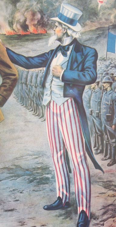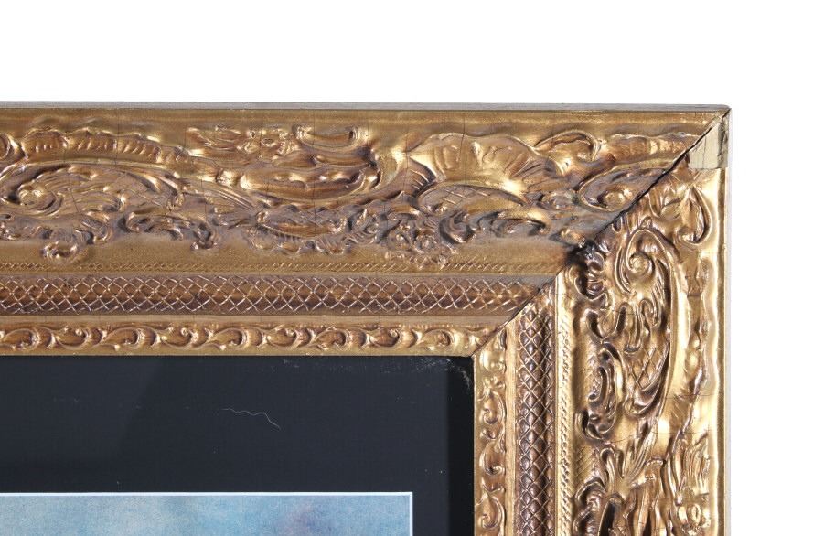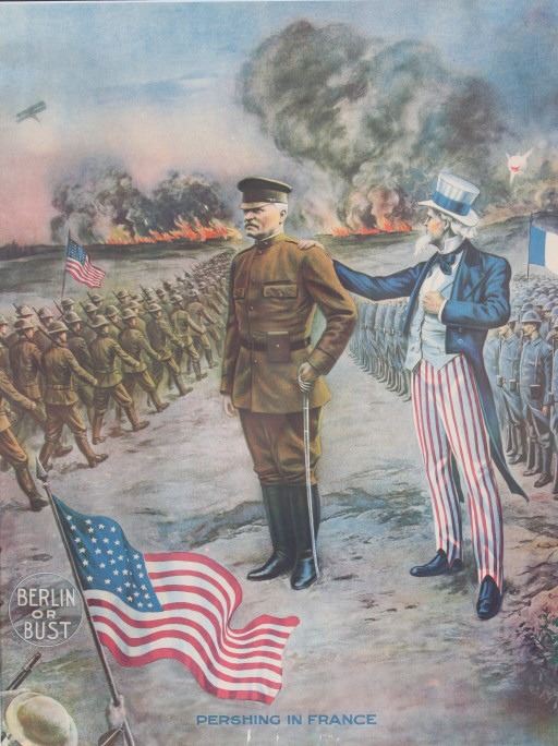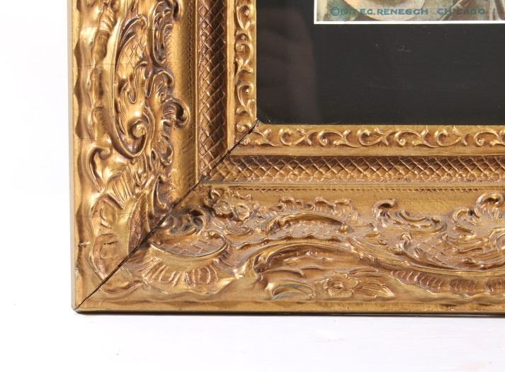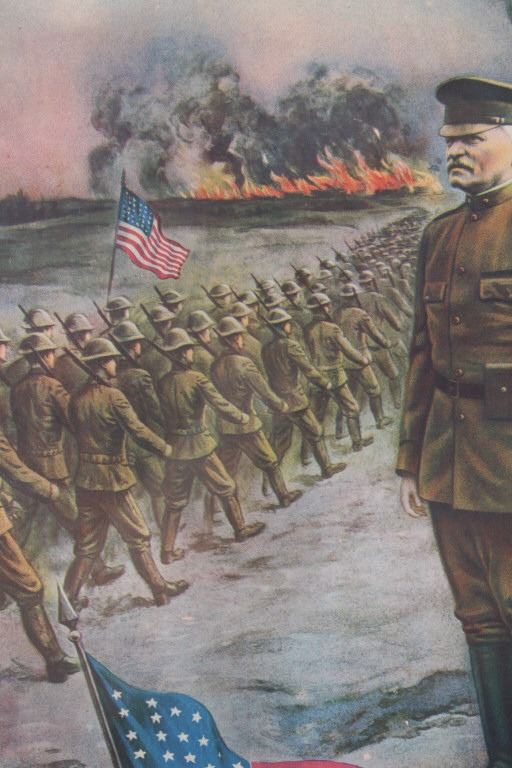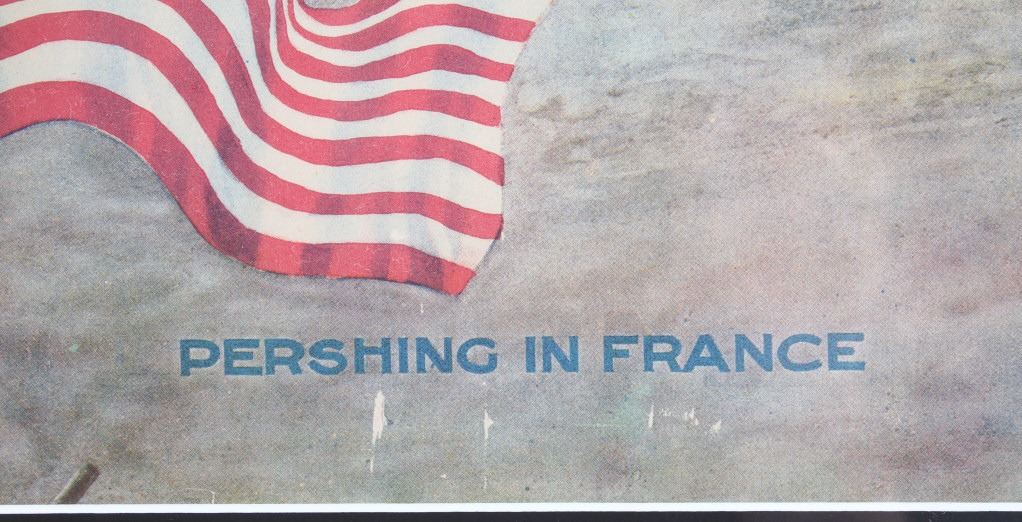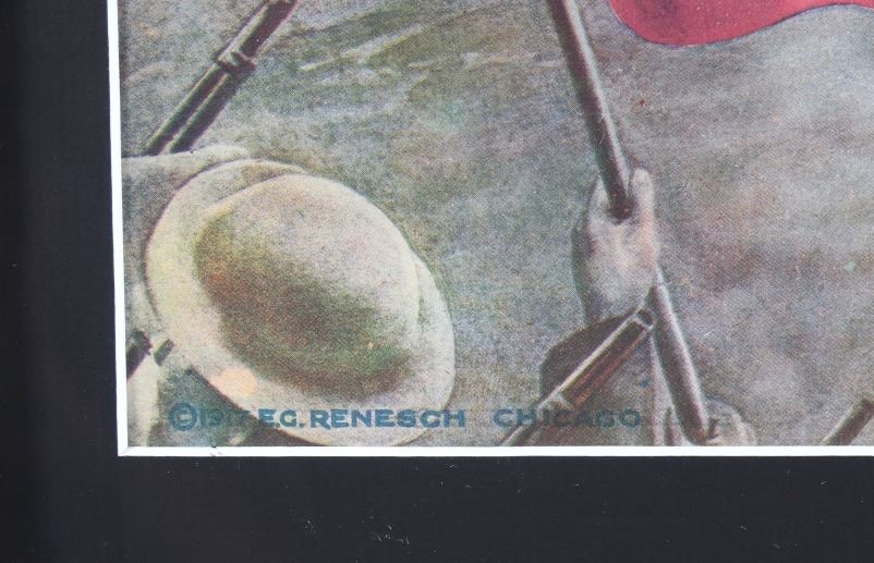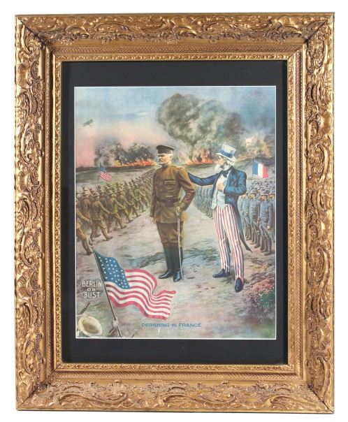 Included in this lot we have a framed World War 1 poster by E. C. Renesch titled "Pershing in France" originating from 1917. The poster depict General of the Army John Pershing standing with Uncle Sam at his shoulder as U.S. Troops march toward a fiery background while the French army stands at attention. The poster shows wonderful detail and coloration. The piece is marked across the bottom reading "Berlin or Bust Pershing In France c1917 E.C. Renesch Chicago". The poster is set into a ornate gold painted frame with embossed floral and geometric patterns with a black border around the poster. The piece shows good condition overall with some light wear on the frame. The frame measures 24 1/4" wide by 30 1/4" tall with the art measuring 15 1/2" wide by 19 1/2" tall.