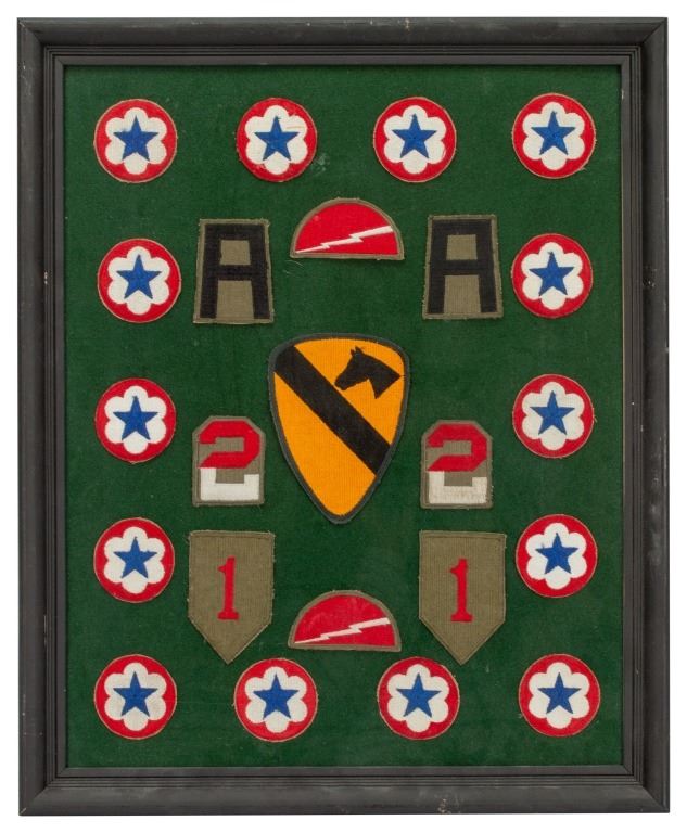 Item/Description: Framed and mounted collection of WWII US Army patches. 23 insignia include: