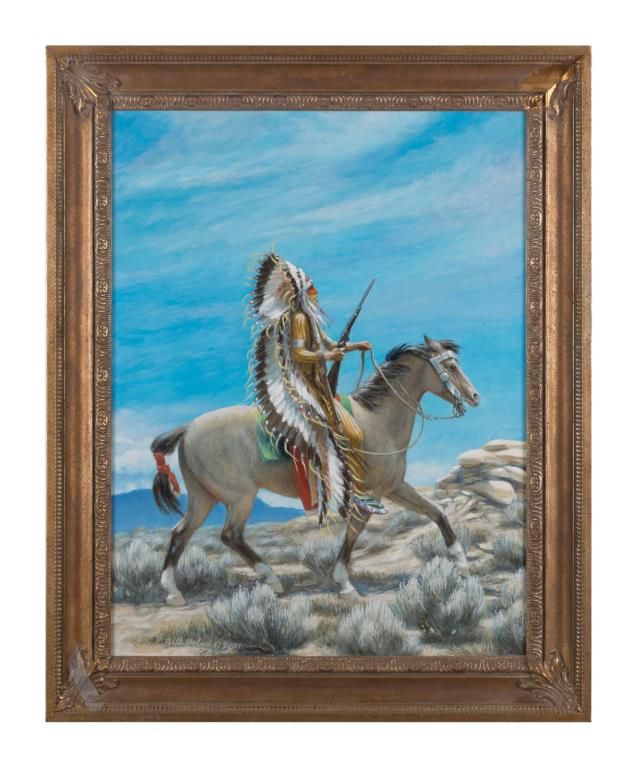 Framed acrylic on canvas by Bill Holm entitled “Brave Song” (2001), approx. 32” x 25” overall showing an Indian brave in full regalia with Spencer carbine on his war pony; great colors and attention to correct headdress, moccasins, etc. by this artist in his depiction of warrior headed into battle. Est.: $150-$300.