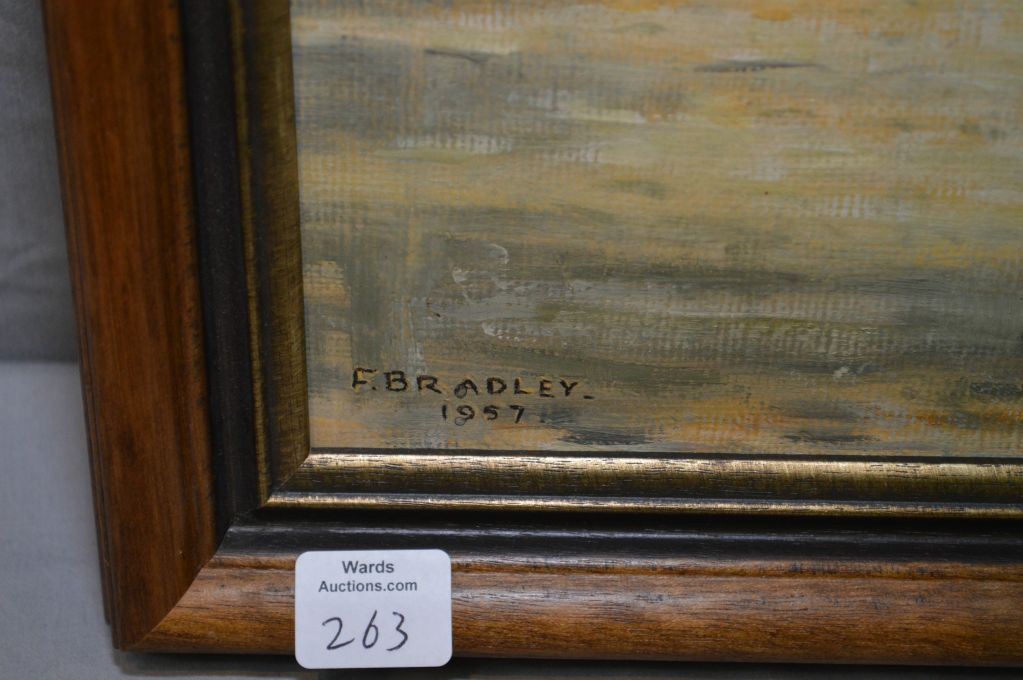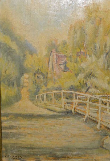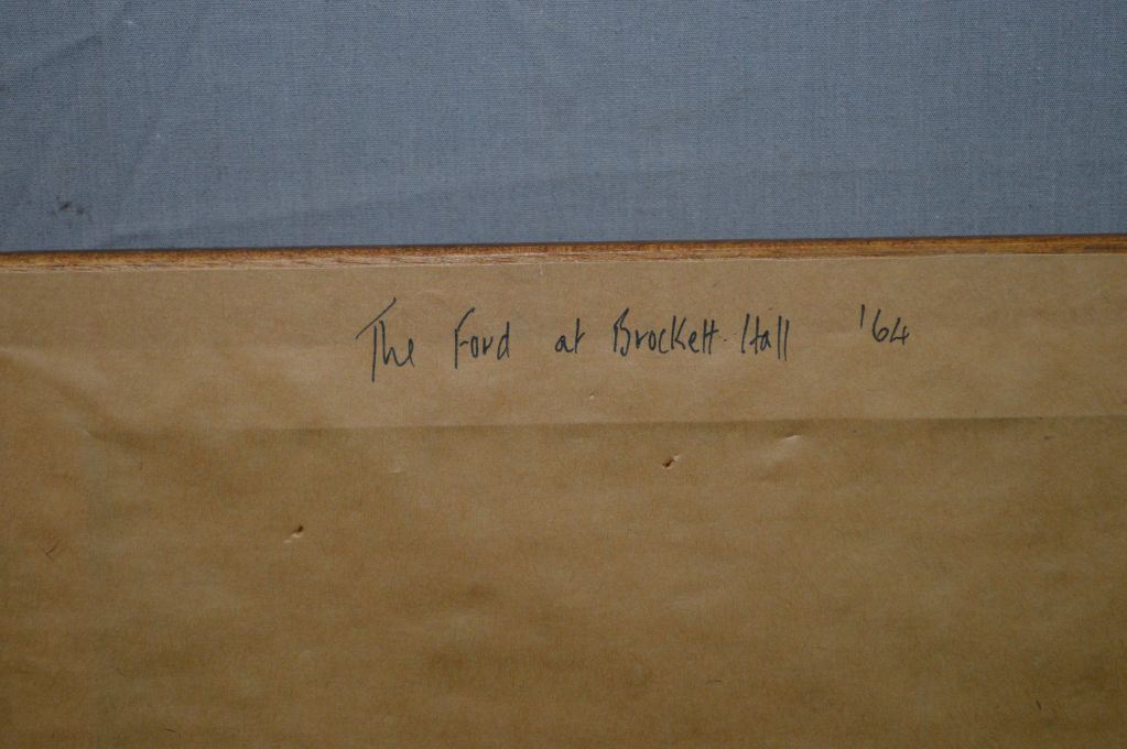 Framed acrylic on canvas painting, titled on verso in new script "The Ford at Brockett Hall" signed by artist F. Bradley 1957, 15" X 10"