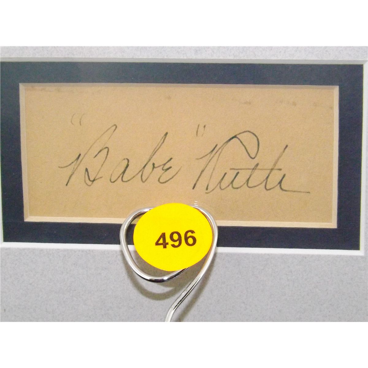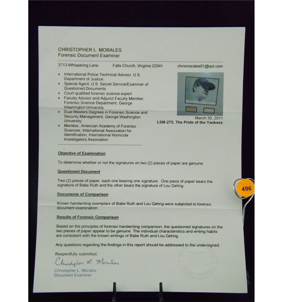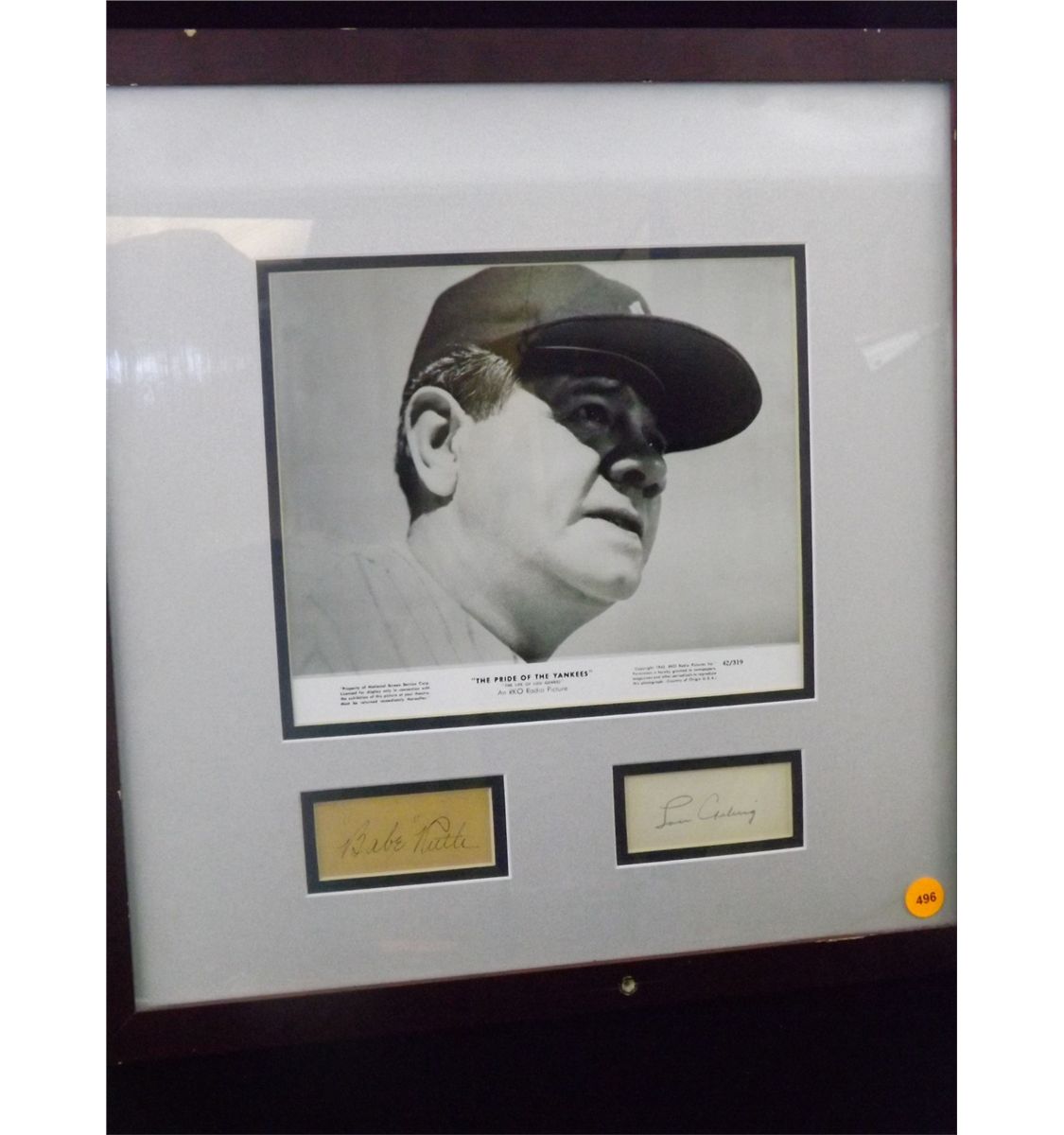 Framed and Matted Display With Babe Ruth Photo "The Pride of the Yankees", and Babe Ruth and Lou Gehrig Die-Cut Autographs Below. Appraised or estimated retail value $7,000. COA by Christopher Morales. All Sales Final. Please see terms and conditions of auction.