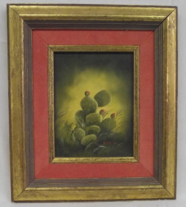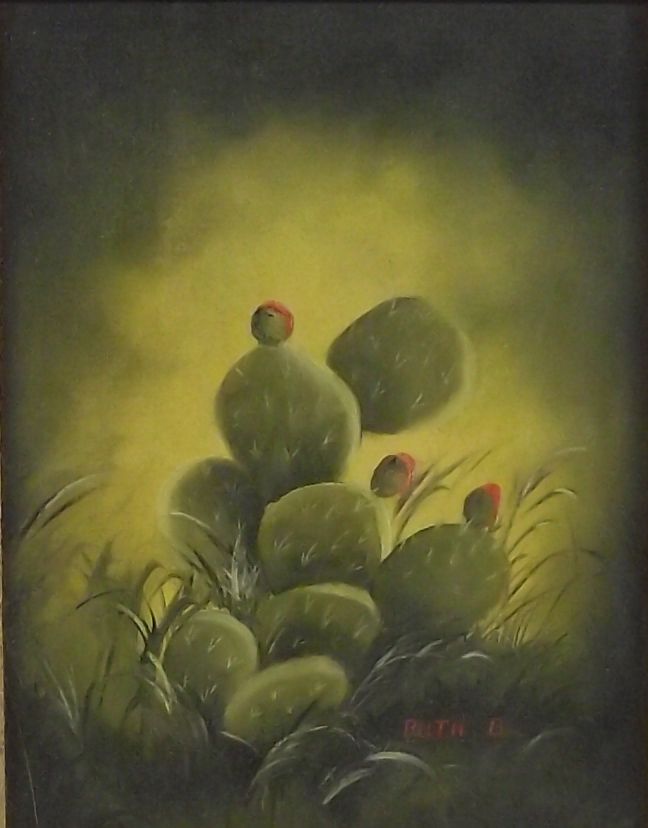 Framed and Matted Signed Original Painting by Ruth B. This piece depicts a prickly pear cactus ready to bloom. It has a visual measurement of approx. 5.5''H x 4.25''W.