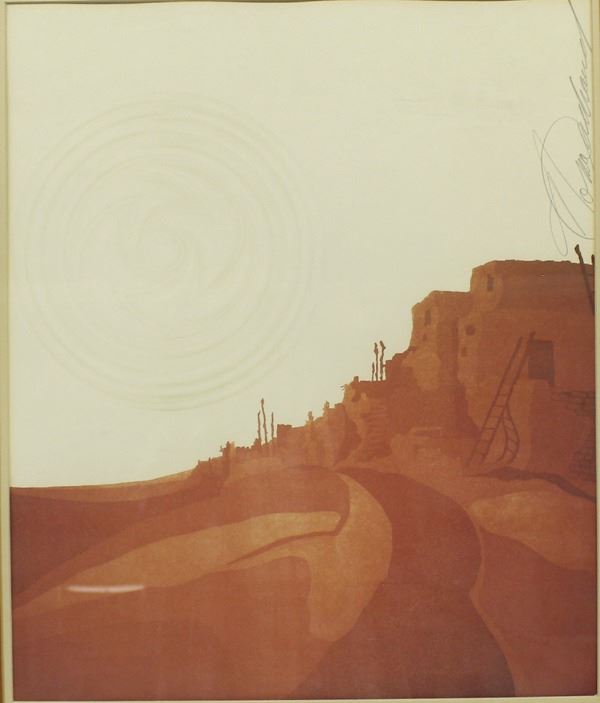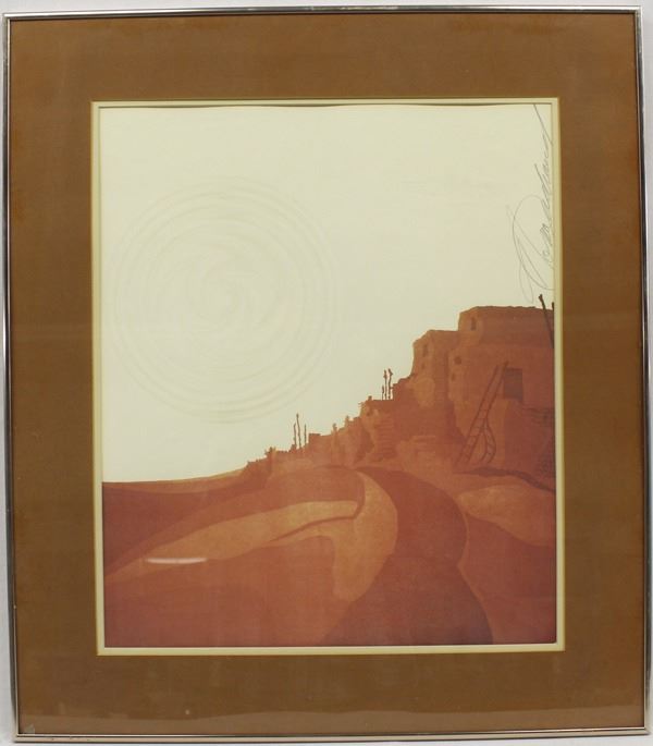 Framed and Signed Print of the Southwest by Norma Andraud (b. 1941), hand signed by the artist, matted and under glass, visual measures 18'' x 21'', overall framed measurement of 28.5'' x 25''