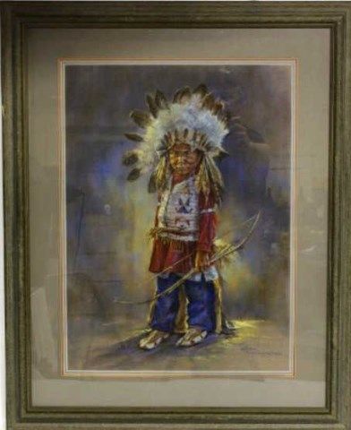 depicting small Sioux boy in beaded vest, moccasins and leggings, holding wood bow and arrow, by Karen Hablutzel, framed 27" X 33". Est. 150-250