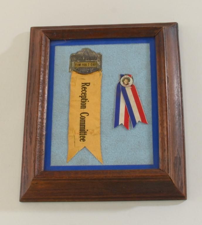 Framed and matted display of two early reception ribbons/pins for Cowboy and Actor Tim Holt, one in overall fair + condition, the other in very good condition. Holt was one of the most popular early Western moviestars in his day having been a real cowboy before his time in Hollywood. Est.: $75-$150.