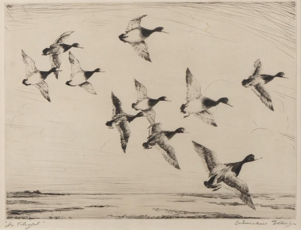 Framed and matted etching of ducks entitled “In Flight” and hand signed by artist Churchill Ettinger (1903-1984); image size is approx. 9-1/2” x 12-1/2”. Ettinger was an accomplished artist and Sportsman. Est.: $125-$175.