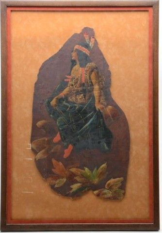 Framed and matted large art deco style color painting on leather of an Indian maiden; nicely accomplished; image size approx. 26” x 14” and in wood frame of approx. 36” x 25”; overall very good condition. Est.:$150-$300.