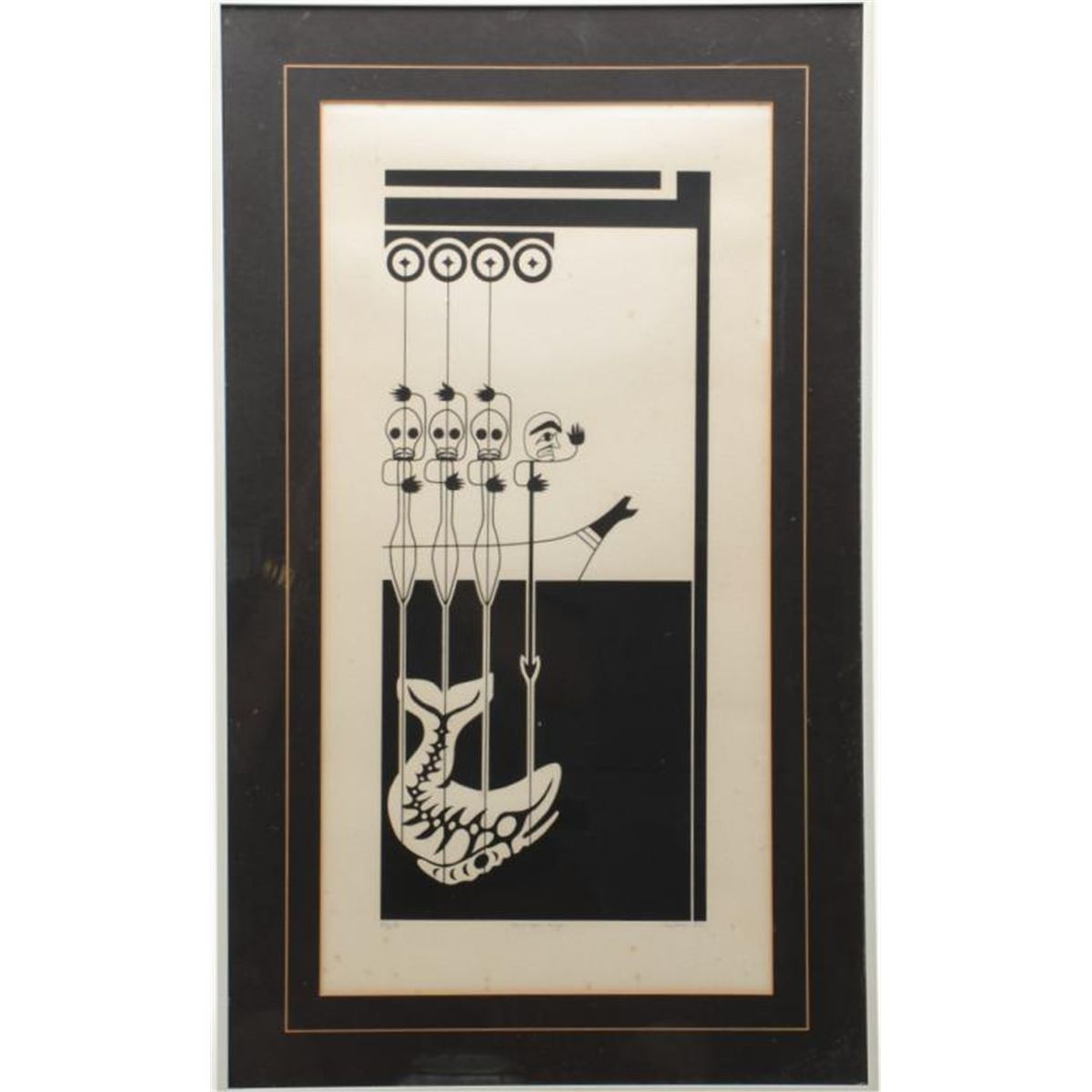 Framed and matted limited edition print entitled “Wi-Wi-Kup”; Northwest Coast style 34/50 signed Nytom, 1982, approx. 22” x 11”; some slight acid burning. Est.: $100-$300.
