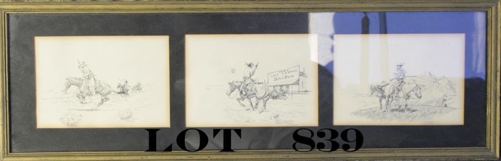 Framed and matted lot of black and white drawings of Western scenes each approx. 6” x 8” and in overall good condition showing some foxing at the edges of the matting and each with the signature “C.R. Crouch 1959” in thelower right hand corner; one shows a cowboy on horseback being chased by Indians; the second shows a cowboy on horseback shooting off his gun in front of a saloon and the third showing a hunter in buckskins on horse and leading a pack animal in the mountains. The frame is older and in generally good condition. Est.: $75-$150.