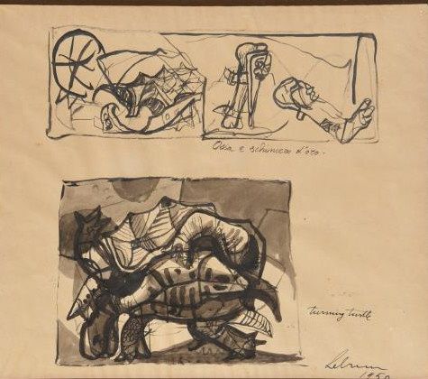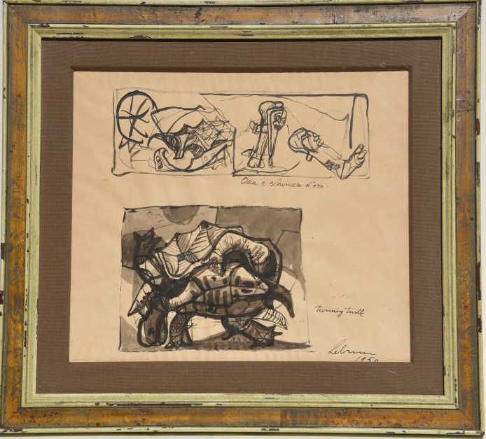 Framed and matted original LeBrun dated 1959, approx. 19” x 21” overall containing 2 impressionistic images; at top “ossa e schiniero d’ozo” and at bottom “turning turtle”. Est.: $250-$500.