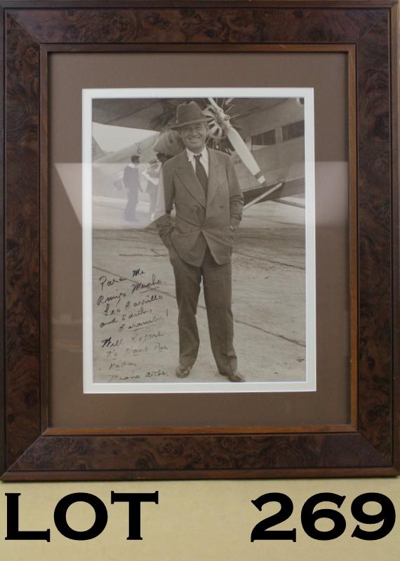 Framed and matted photo of Will Rogers standing behind a prop airplane with a handwritten sentiment on the lower left corner “Para Me Amigo Mucho, Leo Carrillo and Edith, Caraniba! Will Rogers, No Wano Par Nada, Mucho Anos”; image is in overall very good condition and approx. 12” x 9” and in an approx. 19” x 16” frame. An important image to actor and celebrity Leo Carrillo from one of the greatest Americans of the mid-20th century. This photo was taken shortly before Mr. Rogers' death as told to us by the consignor. Est.: $750-$1500++