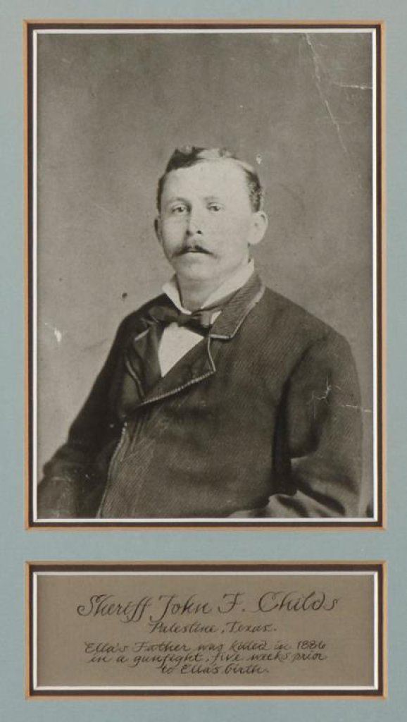 Framed and matted photocopy of Sheriff John F. Childs of Palestine, Texas with notation “Ella’s Father was killed in 1886 in a gunfight, five weeks prior to Ella’s birth”. Est.: $50-$75.