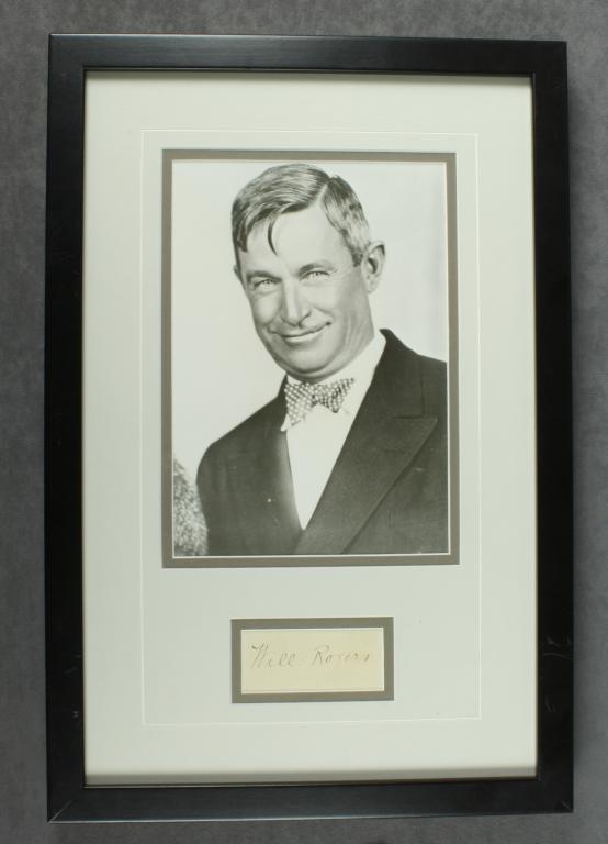 Framed and matted photocopy of Will Rogers  and a signature with frame approx. 18” x 12”  overall; both items in very good condition.   Est.:  $200-$400.