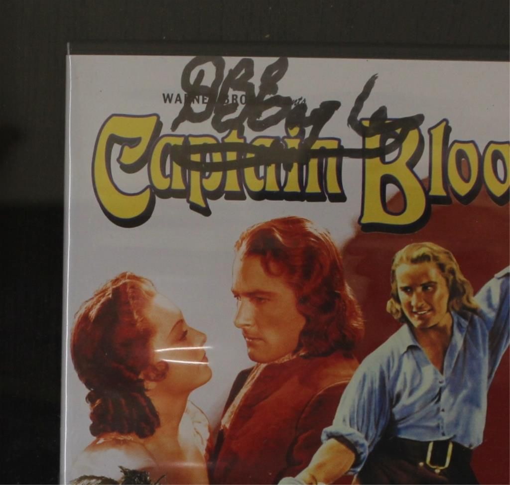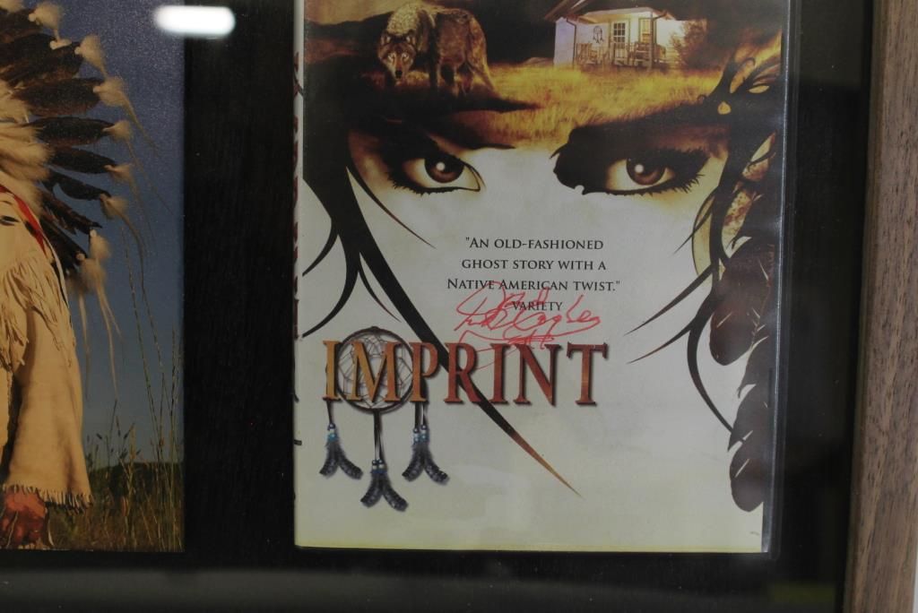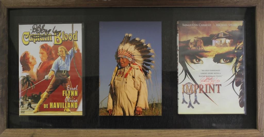 Framed and shadow boxed Captain Blood and Imprint signed by South Dakota Sioux DB Eagle with color photo of him.