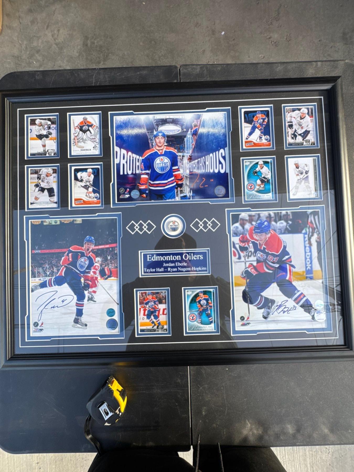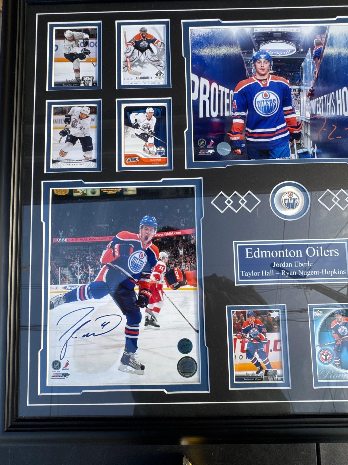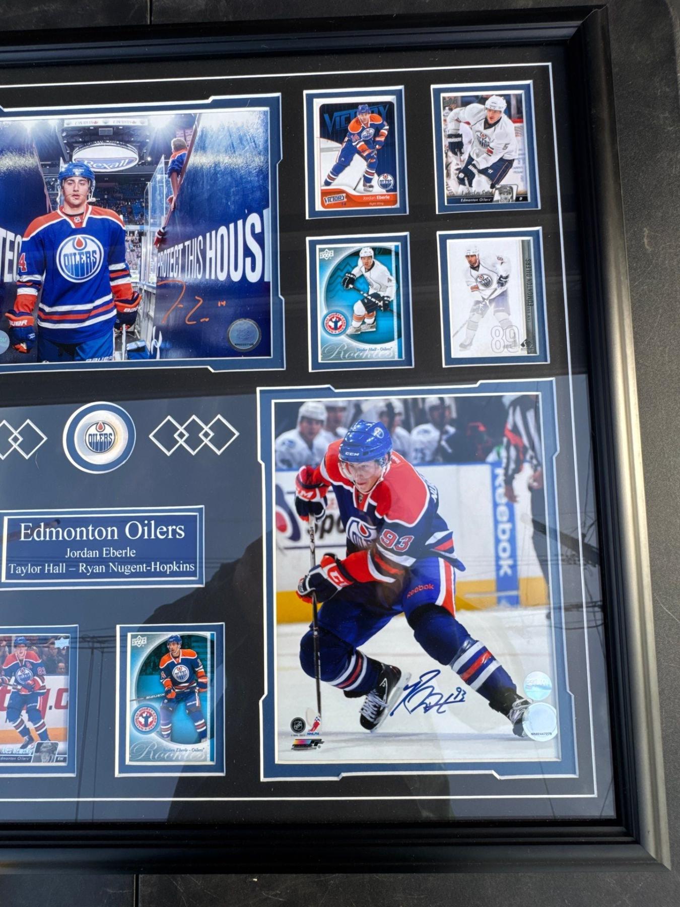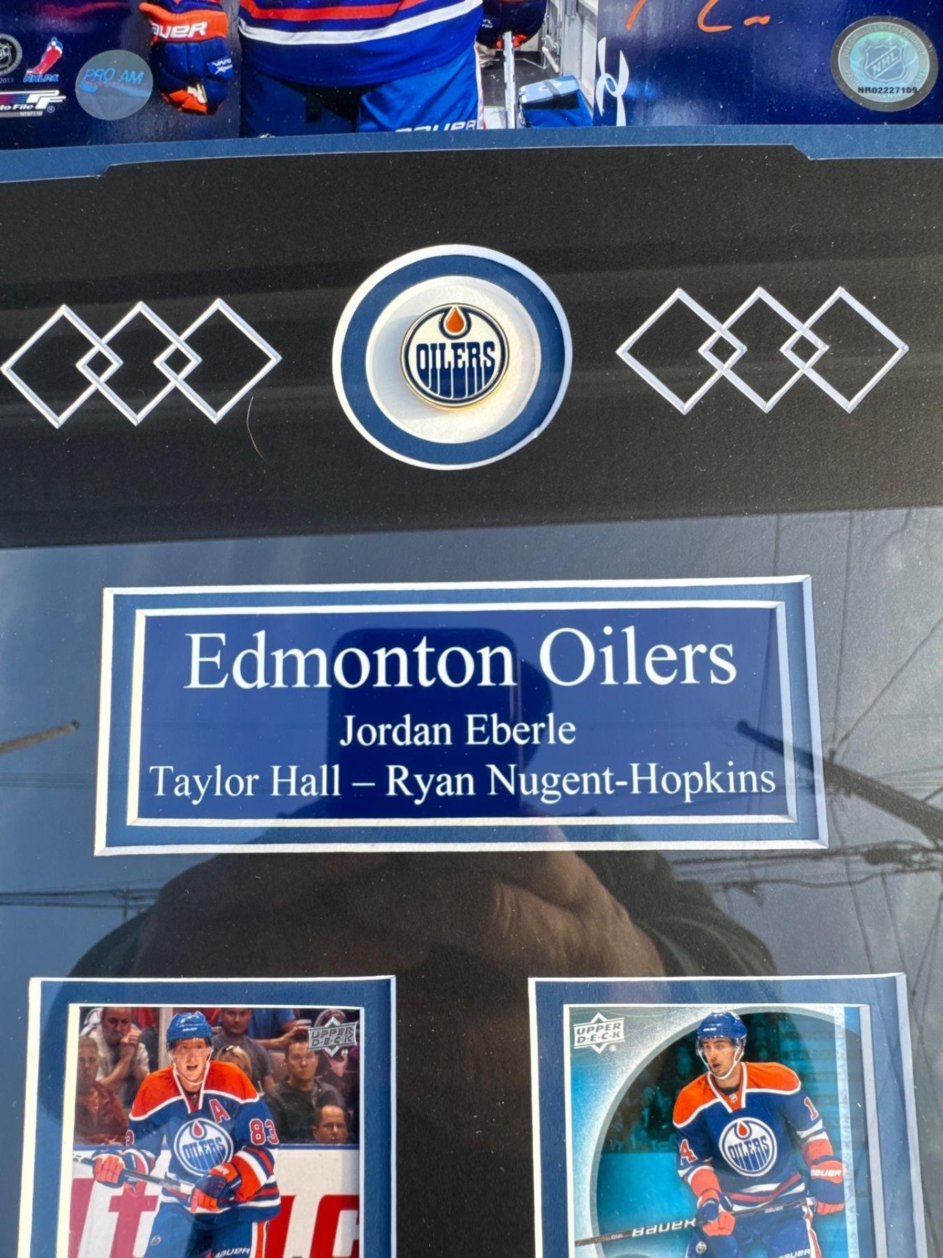 Framed autographed memorabilia containing personally autographed eight by 10 photo of Jordan Ebrele, personally autographed eight by 10 photo of Ryan Nugent Hopkins, personally autographed eight by 10 photo of Taylor Hall with certificate. Thirty and three quarters long by two and a half, 24.5 wide.