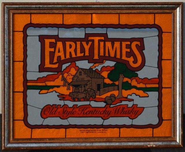 Framed bar advertising mirror for Early Times Kentucky Whisky, approx. 15” x 18” in overall very good condition. Est.: $25-$50.