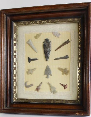 fish hooks and drills, larges 3 1/2", mounted in Victorian walnut frame.