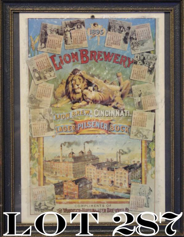 Framed color advertising print for the Lion Brewery, “Compliments of the Windisch-Muhlhauser Brewing Co.” showing spread out calendars dated 1895 with lions and a photo of the brewery; in overall fair + condition showing good color with some scattered scratches and losses; frame is colored black with gold trim and appears to be early 1900s. Great decorator for the den or office. Est.: $100-$200.
