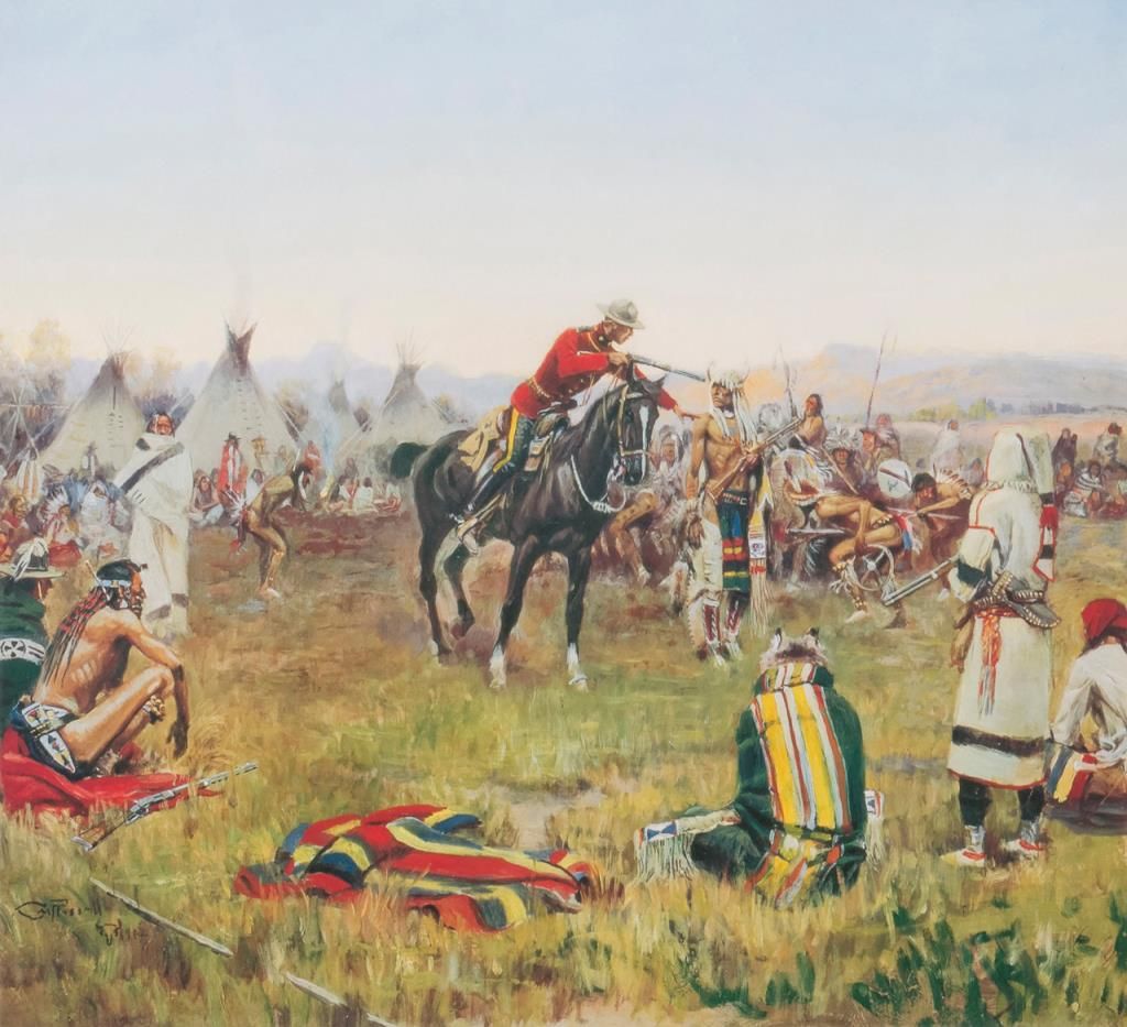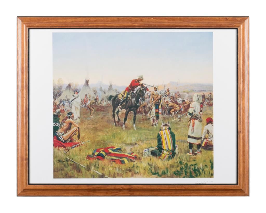 Framed color print of a Charlie Russell work “Single Handed” showing a Canadian Mountie making an arrest of an Indian brave by himself in a hostile village, approx. 21” x 27”. Est.: $50-$100.