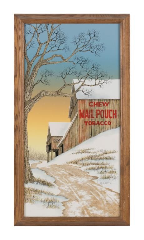 Framed colorful paint on canvas, signed H. Hargrove of a barn in winter scene with “Chew Mail Pouch Tobacco” advertiser on the side of the barn; approx. 27” x 14” overall; a great decorator reminiscent of the rural country roads ofyesterday! Est.: $125-$175.
