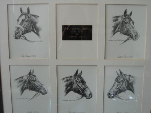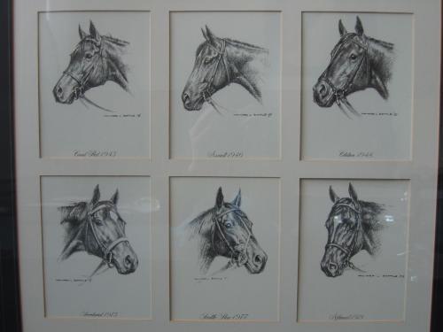 This item displays drawings of the Triple Crown winners from 1919-1978, by Howard L. Battle. The horses shown include Sr. Barton (1919), Gallant Fox (1930), Omaha (1935), War Admiral (1937), Whirlaway (1941), Count Fleet (1943), Assault (1946), Citation (1948), Secretariat (1973), Seattle Slew (1977), and Affirmed (1978).