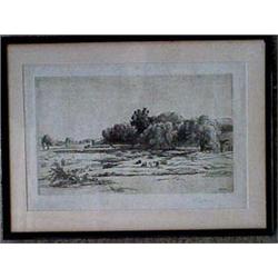 Framed etching of landscape with cows and water, signed on plate and pencil signed P. Moran (L.R.), listed Philadelphia artist, image measures 9" x 14 1/2"