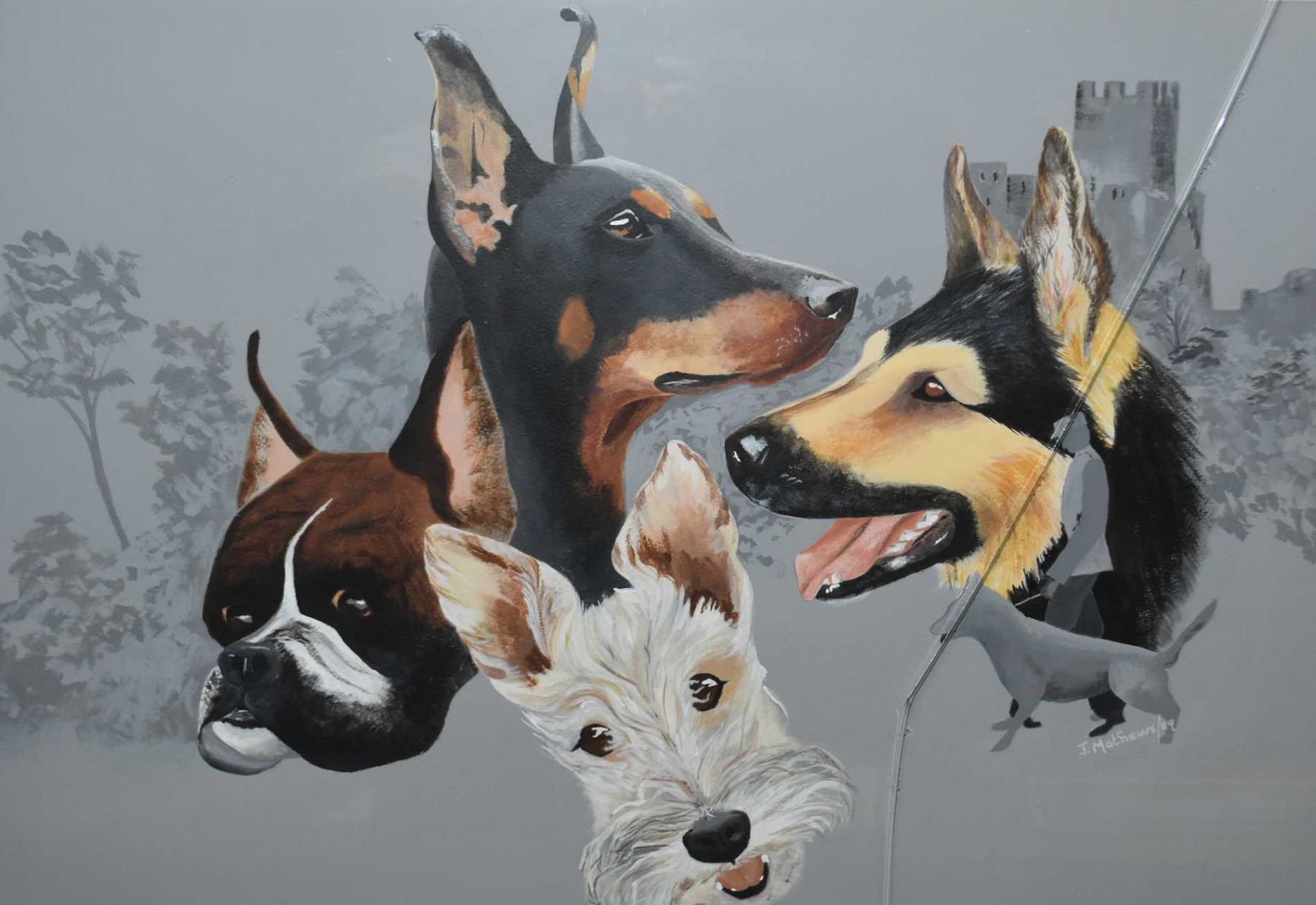 Framed gouache paper portraits of different breeds of dogs signed by artist J. Mathews '89, 19" X 27", need glass repair