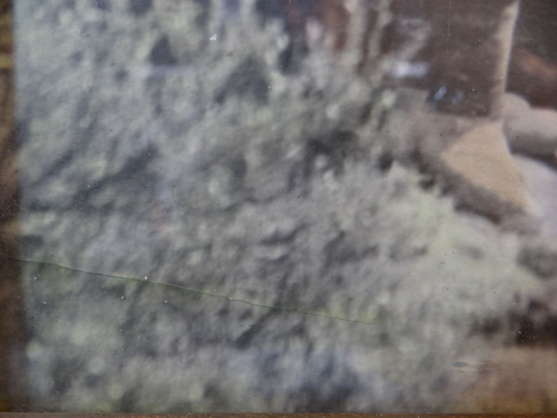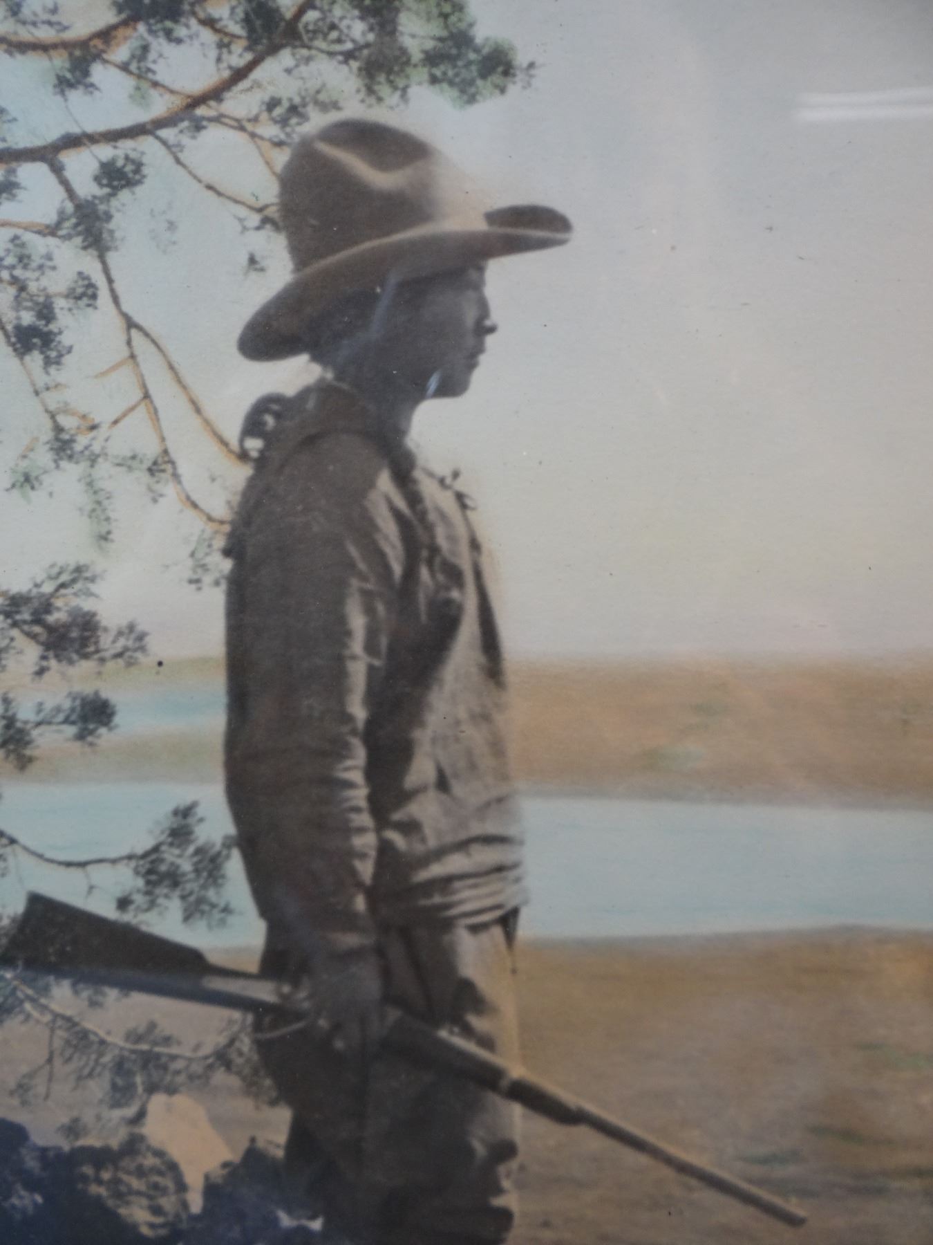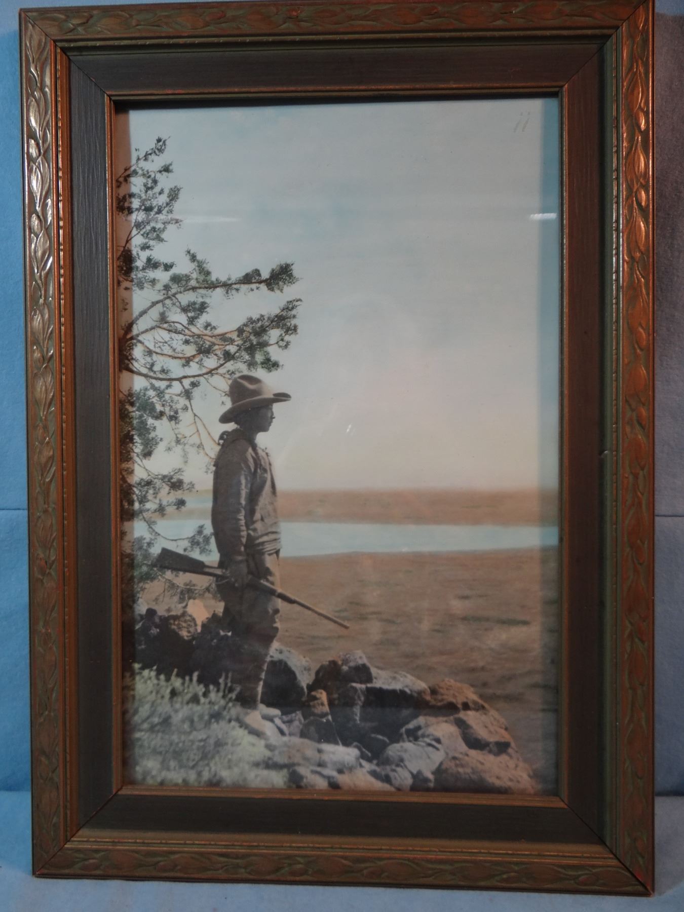 Framed hand tinted old photo of a young man with a rifle standing next to a tree, 10" x 1 6"
