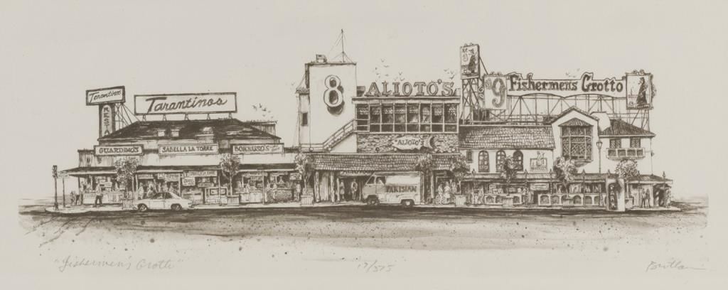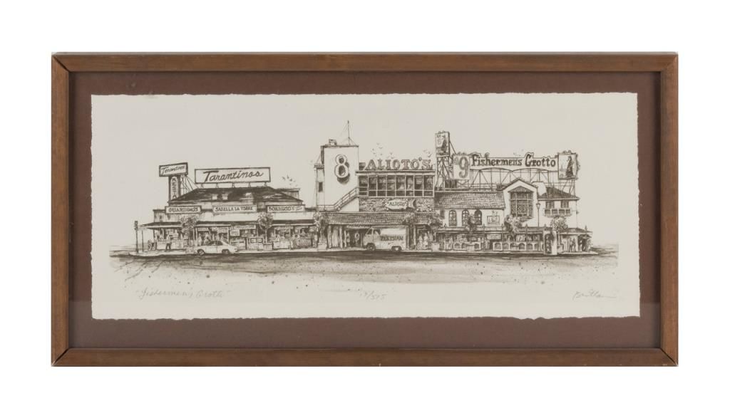 Framed limited edition (17/375) hand signed print entitled “Fisherman’s Grotto” by Britain, of the famed San Francisco wharf area of Tarantinos and Alioto’s; approx. 10-1/2” x 21” overall. Est.: $75-$125.