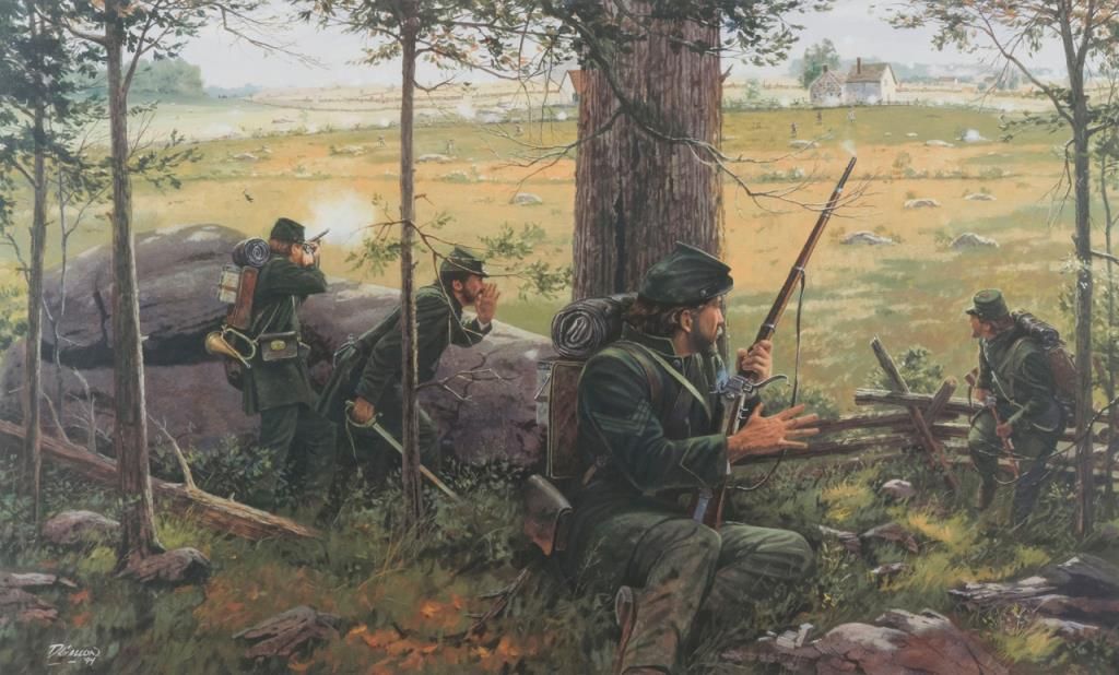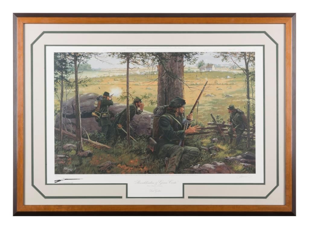 Framed limited edition print entitled “Breech Loaders and Green Coats” showing Berdan sharpshooters by Dale Gallon numbered 668 of 950. Approximately 20” x 28” not including frame. Est.: $100-$300