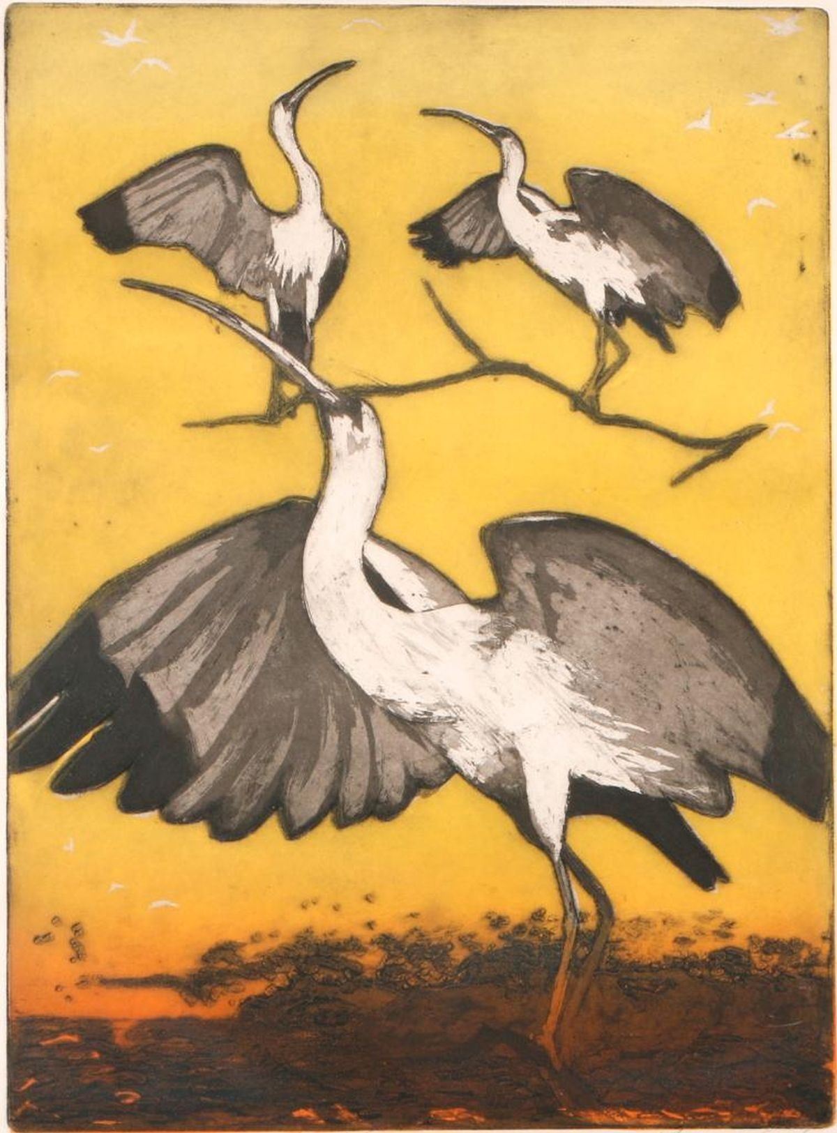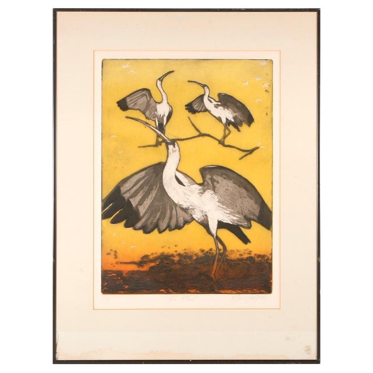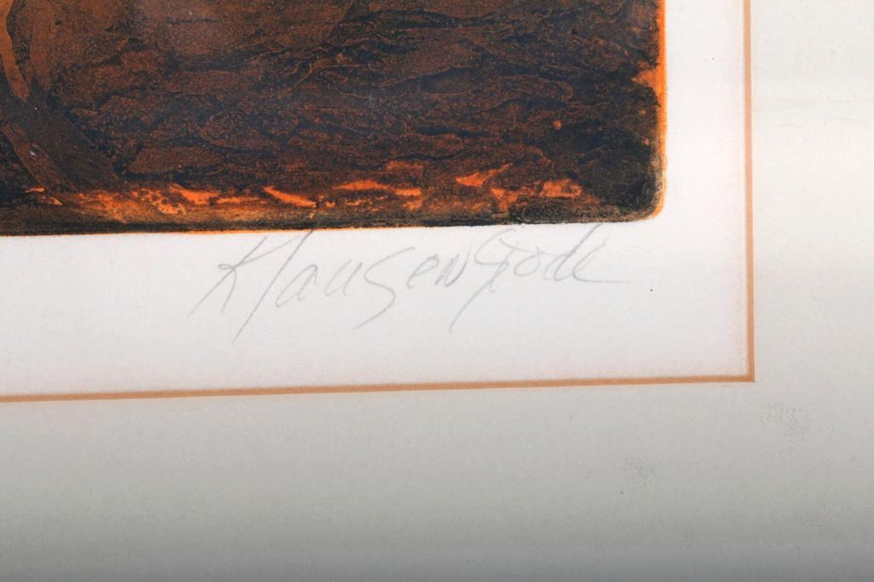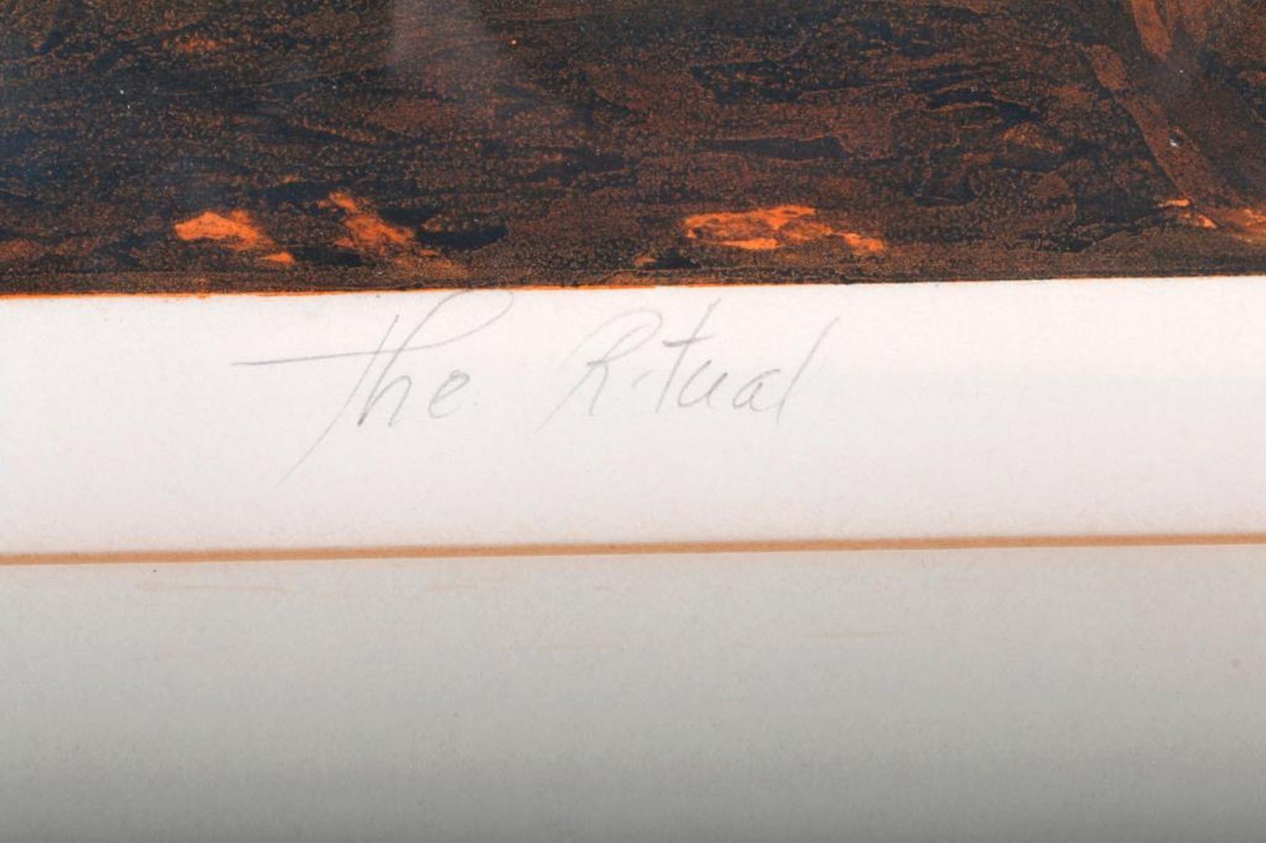 Artist: "Klausenstode". Subject/Title: "The Ritual". Date Created: 20th century. Medium: Lithograph "Sp.". Size Image: 19 1/2 inches high x 14. Size Frame: 27 inches high x 20 1/2. Condition: Good. Some stain to frame, a small break in glass lower left.
