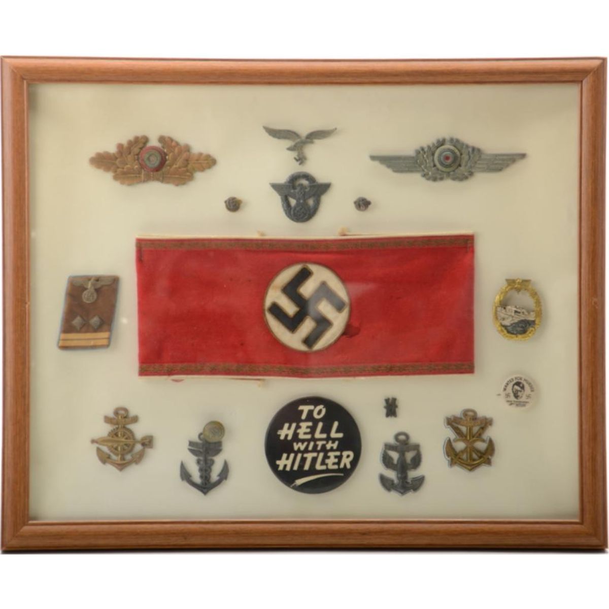 Framed lot of WW II pins, badges and militaria, mostly nazi-related (frame is approx. 18” x 22”) including a red cloth banner with swastika in middle, several German naval medal pins, some cap emblems,uniform pins, and two anti-Hitler allied pinbacks, one “To Hell with Hitler” and the other “Wanted for Murder”; some scarce items in this lot. Est.: $250-$400.